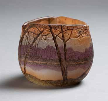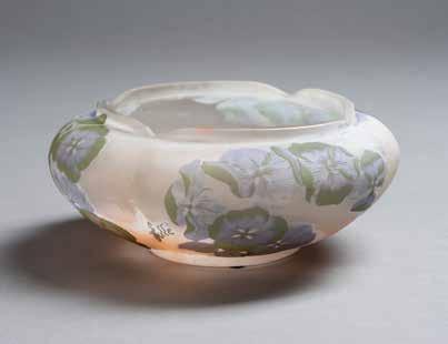 Farbloses Glas, innen opalisierend, rosa und gelbe Pulvereinschmelzungen, bersteinfarbener Überfang, Ätzdekor. H. 31 cm. Auf Wandung bez. ‚Gallé‘ (hochgeätzt). Auf eingezogenem Rundfuß ovale Vase, beidseitig geflacht. Weit ausgestellter Lippenrand.