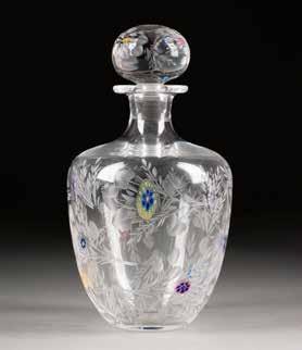 Kristallglas, versilberte Montierung, Email. H. 11,5 cm. Facettierter, konischer Korpus mit ornamentalem Floraldekor in Silbercloisonné. Part. besch.
