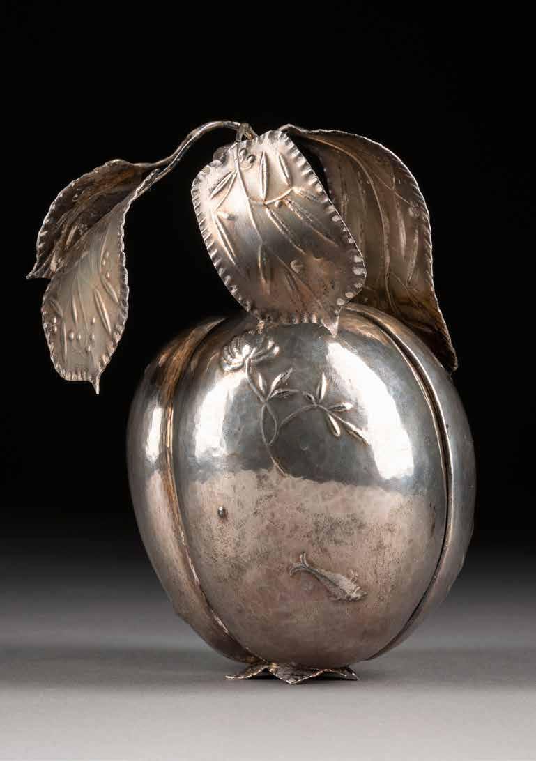 Rochenhaut, grün gefärbt, Holz, Silbermontierung. D. 11 cm, H. 8 cm. Verso: Gebrauchsspuren, part. ber. und best. Über einem runden Holzkern gespannte, lindgrüne Rochenhaut und Silbermontierung mit Rosenmedaillons am Steckdeckel.
