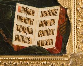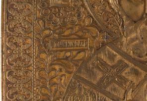 Oil on wood panel. Overlaid with a chased metal oklad. 31.5 x 23.5 cm.