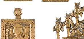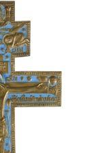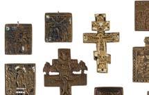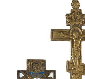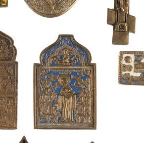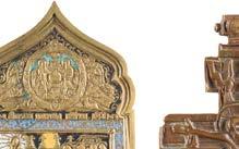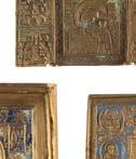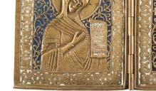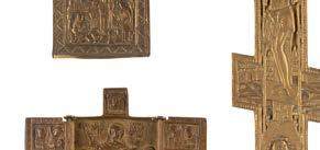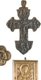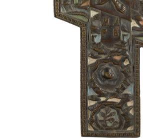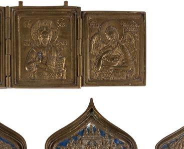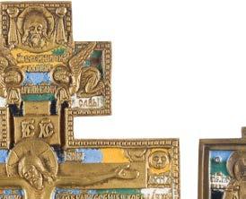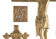 Einzeltafel mit zwei Rückseiten-Sponki. Doppeltes Kowtscheg, Eitempera. Bronze, mehrfarbig emailliert. 31,8 x 27 cm / L. 18 cm. Substanzverluste. AN ICON SHOWING THE MANDYLION AND A BRASS AND ENAMEL CRUCIFIX