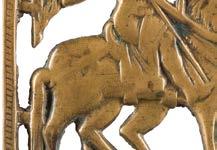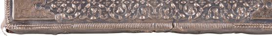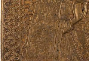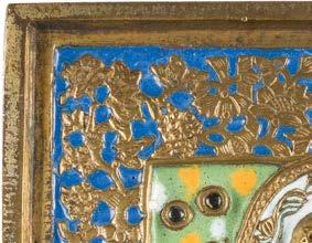 Holztafel, Ölmalerei, Metalloklad mit Reliefdekor. 31,5 x 23,5 cm.
