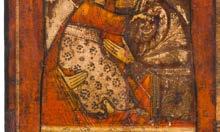 Holztafel mit zwei Stirnseiten-Sponki. Ölmalerei, Hintergrund und Rand vergoldet. 28,5 x 24 cm. Min. Farbabsplitterungen.