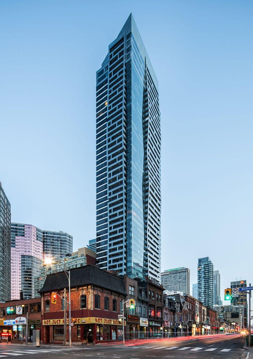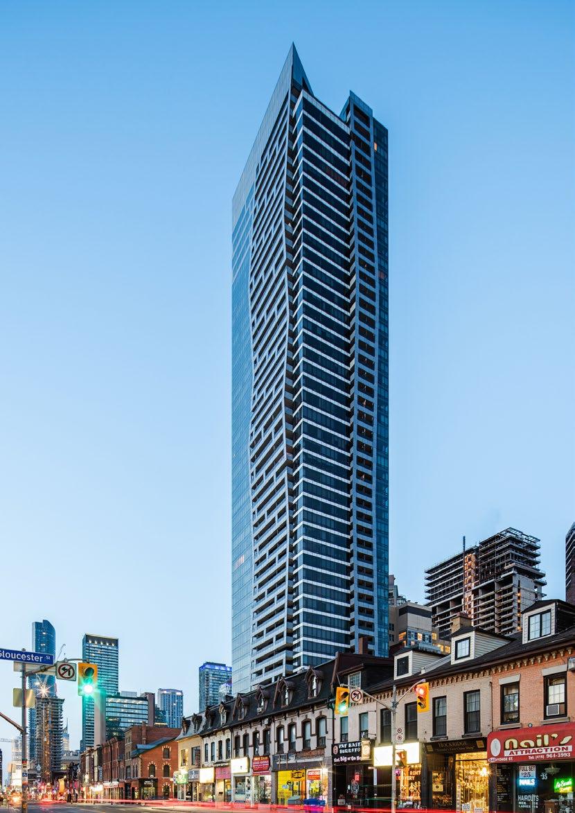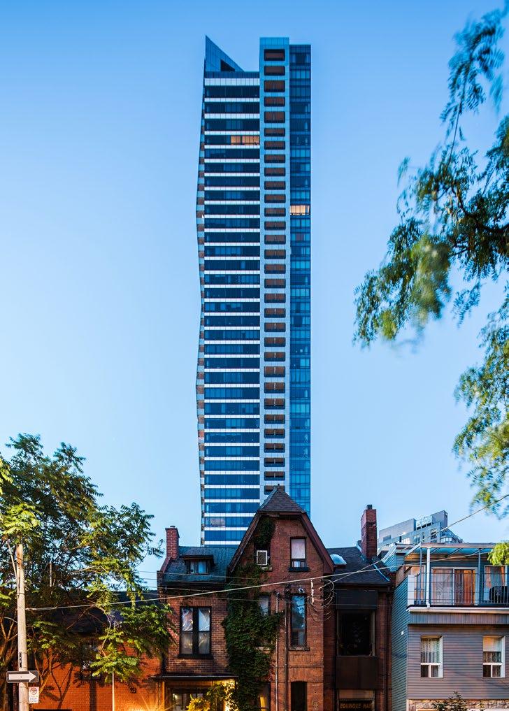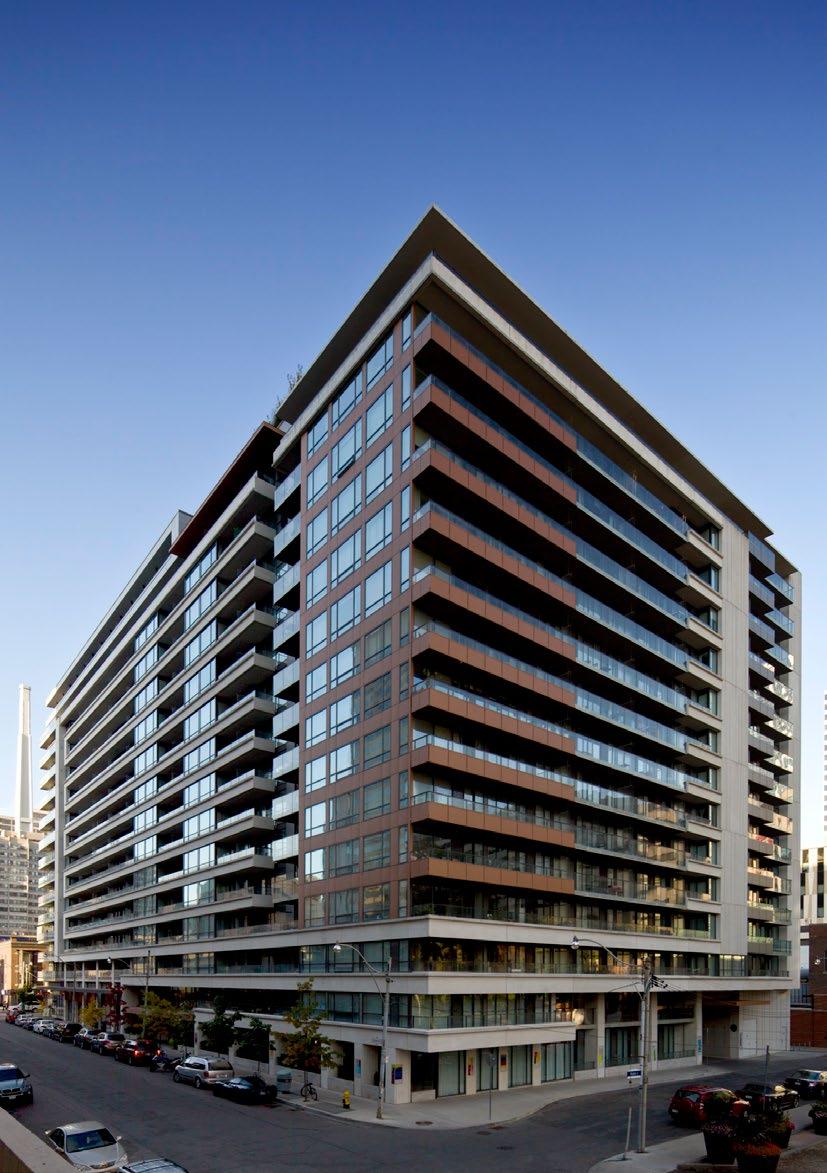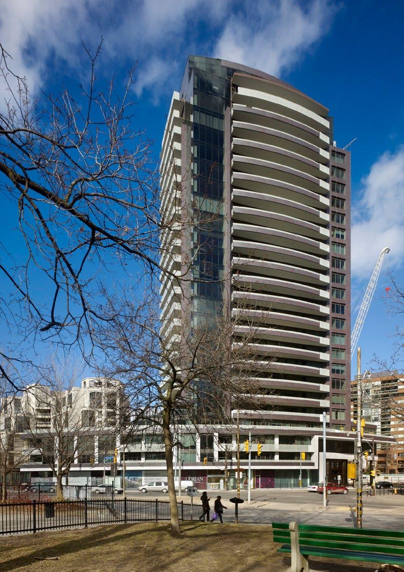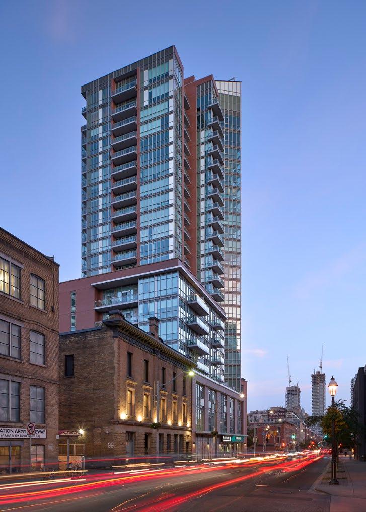 This 25-storey mixed-use project features retail space at the ground floor level and large, luxurious units above. High-end amenities such as an indoor pool, state-of-the-art fitness centre and fourth floor rooftop garden complement the spacious suites. The material palette reflects the luxury market for living units in a prime Toronto location adjacent to all the urban amenities of downtown.