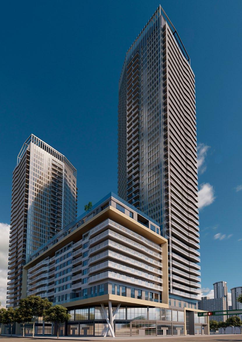Block 22 is a new residential development that is part of the re-imagined Square One Master Plan in Mississauga. Featuring two towers of 55 and 65 storeys respectively, alongside a 7 storey podium, the buildings add nearly 1300 new residential units as well as significant retail, and amenity spaces to this growing community. Drawing inspiration from the iconic towers of the 20th century, the buildings feature punched windows to maximize energy efficiency while their tall, slender profiles reduce the shadowing impacts and increase the access to sunlight and skyviews around the development.