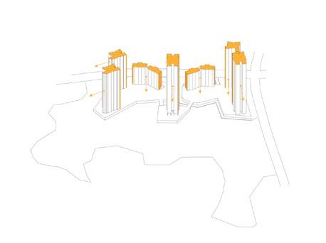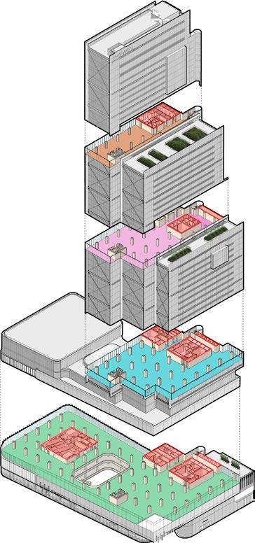 The Well Exploded Axonometric view: the various-level pedestrian pathways linking the different buildings making up the masterplan