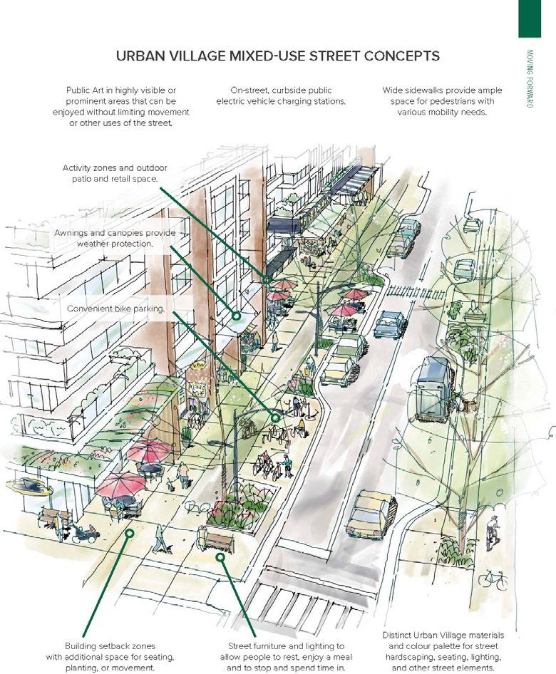 An architecturally distinct urban village, providing a complete live-work-play community that is lively and pedestrian-oriented.