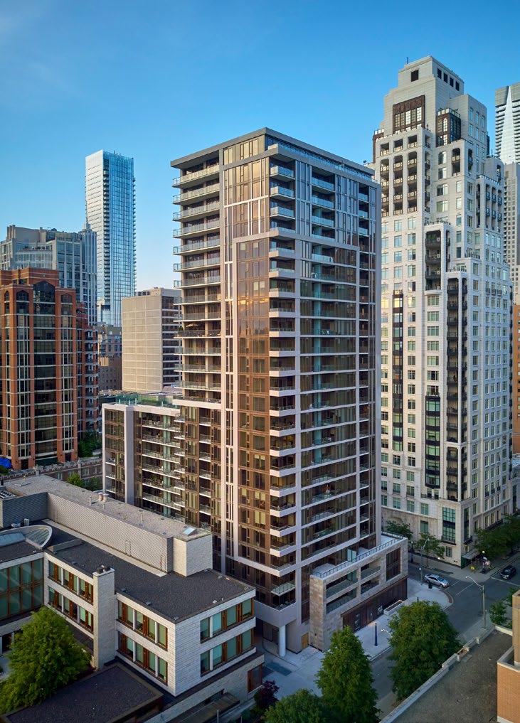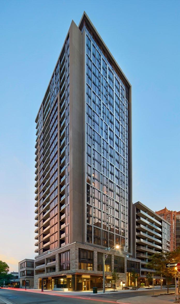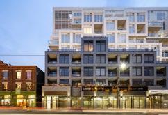 Addressing the adjacent buildings with complementary podium heights, the pigmented concrete cladding and dark-tinted windows contrast with the red and buff brick surroundings. The sculpted form allows for a variety of distinct layout plans for the 358 units. Sophisticated amenities include a party room and a rooftop urban park.