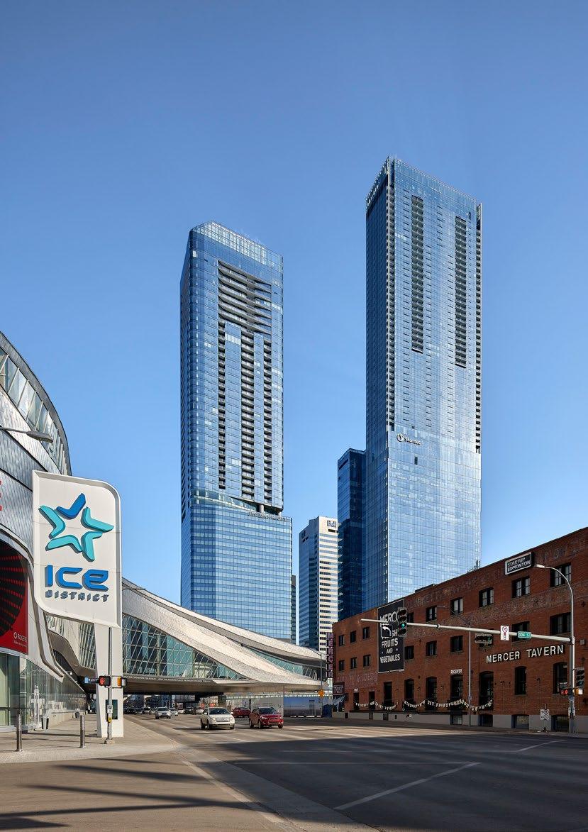 The built form consists of two slim, high rise residential towers (45 and 35-storeys) with small floor plates and a chamfered facade on a partial two-storey podium connected with a midrise residential “Link Building” (11-storey). The rooftop of the Link Building will feature outdoor amenity space for the residents to enjoy year-round. This design will offer a dynamic massing while providing sunlight penetration to the planned Warehouse Campus Neighbourhood Central Park to the northeast. A break in the podium, between the two towers, forms a large open-air Porte-Cochere, providing a connection to the park from Capital Boulevard. At street level, retail spaces wrap around the corner of the building’s podium, forming an active, pedestrian-scaled streetscape. The podium will create a new access point to the Corona LRT Station. This, along with bus routes, bike paths, and pedestrian access, form a connection not only to downtown Edmonton, but the North Saskatchewan River Valley and the rest of the city as well.