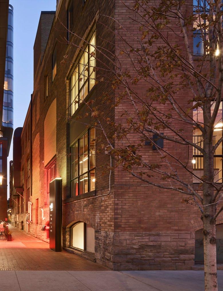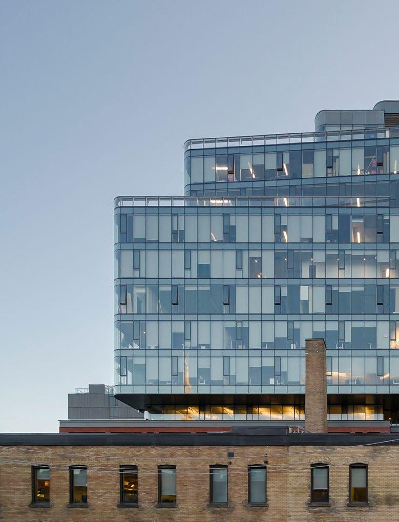 Balconies and breaks in the façade add subtle detail. The fins run from the base to the top of the tower, enclosing two storeys of mechanical infrastructure. Illuminated from within, the crown is like a glowing lantern at night. The design meets current energy code guidelines through a ratio of 40:60 window to solid construction. With more than a quarter of the development assigned to office space, and a significant portion of the residences sized for families, 19 Duncan Street meets the City of Toronto’s goals to add mixed-use, sustainable density, in close proximity to a subway station.