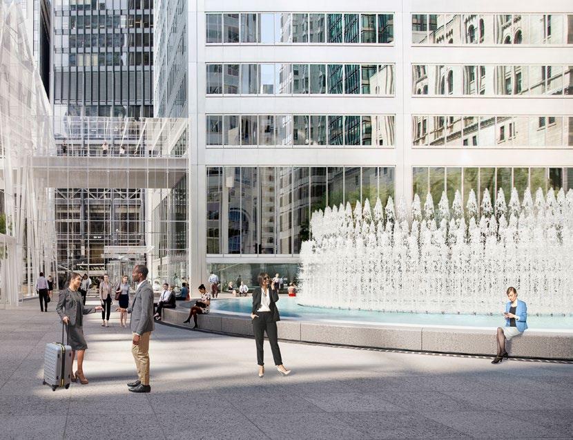 The Pavilion will be the grand entrance for the tower and will be enclosed in transparent glazing, allowing natural light to flow into the concourse level and maintaining a high degree of visibility from Wellington Street to the Courtyard within the campus. The project will be directly connected to the city’s underground PATH network and nearby rapid transit services in an area with significant pedestrian traffic, existing retail and office development. The fountain will be raised relocated in its original form with the removal of the stairs, allowing barrier free access throughout the plaza. Open and inviting, the Pavilion space will stand four storeys high and provide occupants with a sense of the city around them.