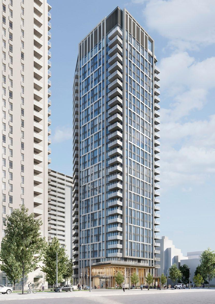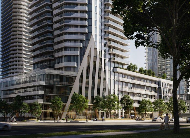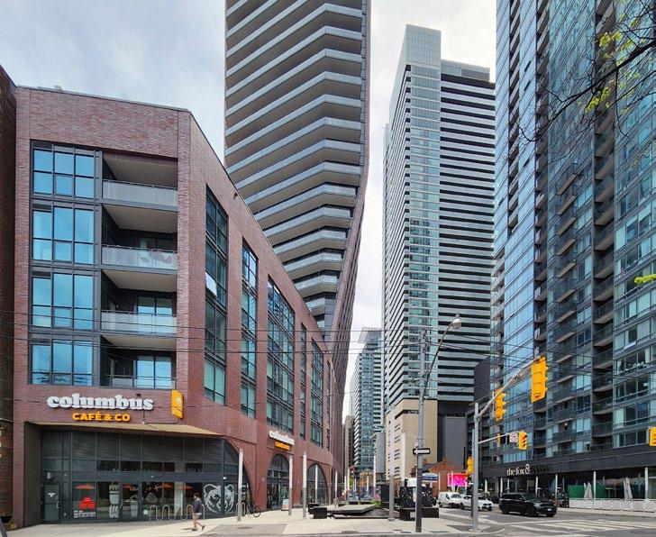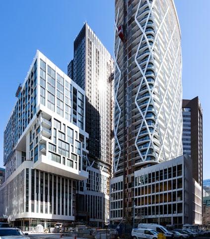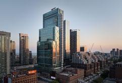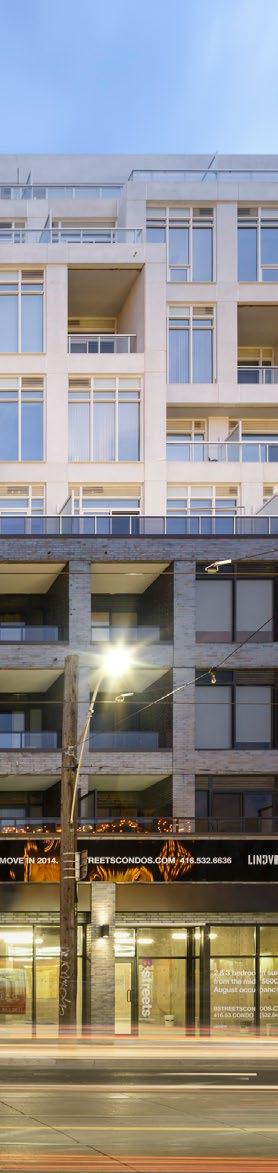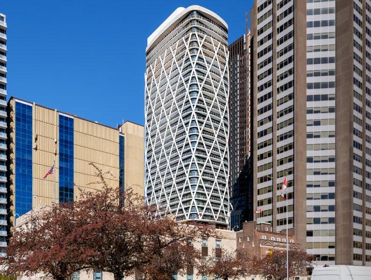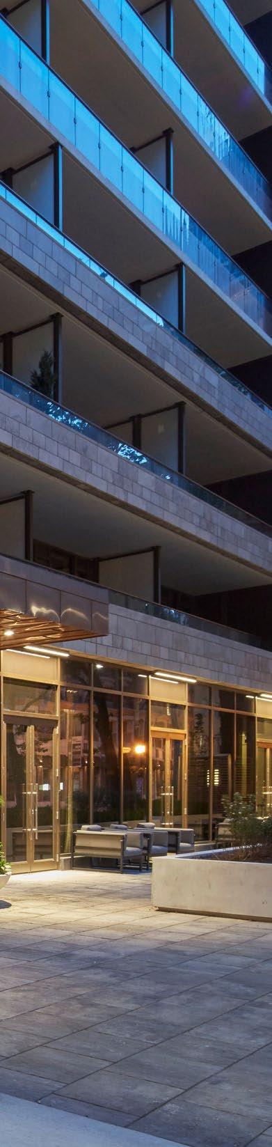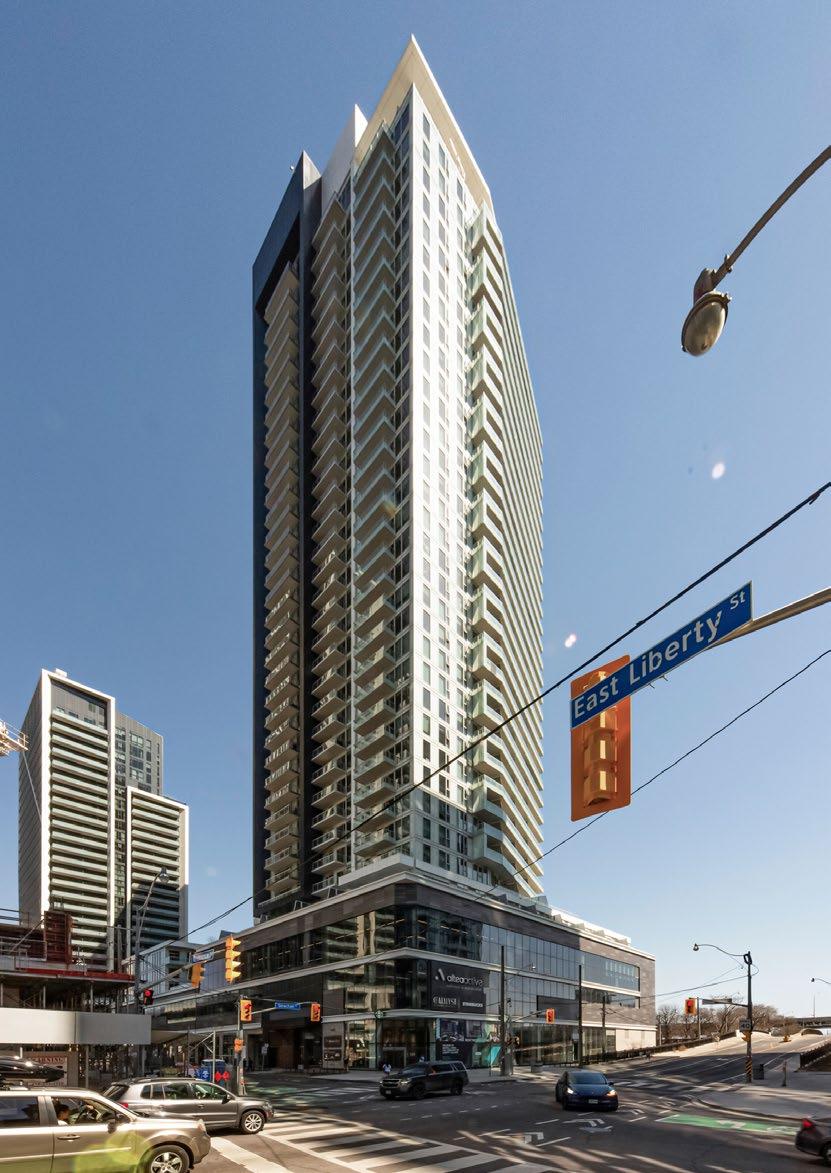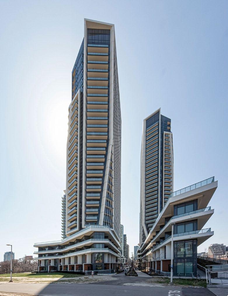 The two NOVUS towers, of 34- and 25-storeys, are a part of the Garrison Point mixed-use development that sits at the east gateway entrance to Toronto’s Liberty Village and is bounded by two railway lines – CN Rail and GO Train – and Strachan Avenue. The towers share a four-storey podium comprised of retail and commercial units on the first three floors and a retail patio located to at the north-east corner. At grade the podium is clad with Algonquin limestone with a granite base to create a luxurious street level atmosphere. The second and third floor commercial areas are clad with terracotta panels to tie in with the red-brick of the existing neighbourhood. Green roofs on the fourth and fifth floors enhance the sustainability profile of the buildings. The towers, visually narrowed through the articulated façades that feature lighter coloured finishes on one side, rise elegantly and are occupied by 579 purposebuilt rental residential units. Indoor and outdoor amenities spaces are provided on the top floor of each tower and shared amenities spaces are located in the fourth floor of the podium. A pedestrian pathway connects the towers to Strachan Avenue to the west and to the planned public park to the east.