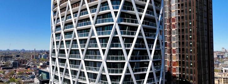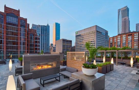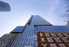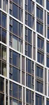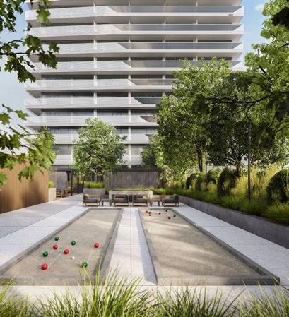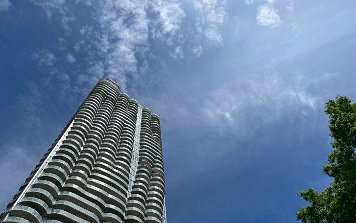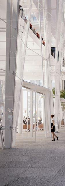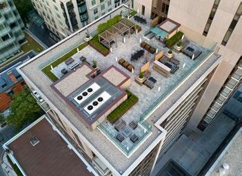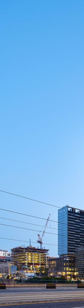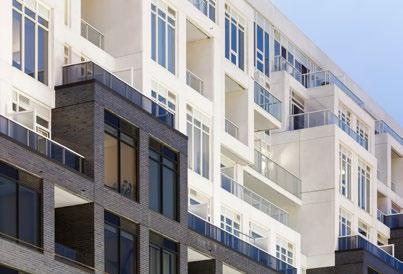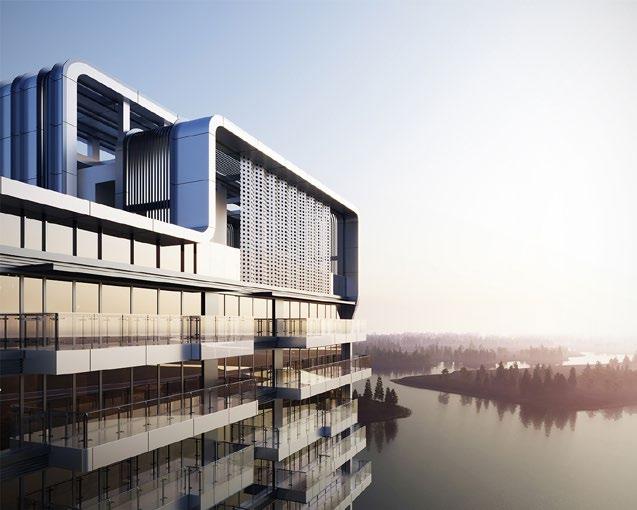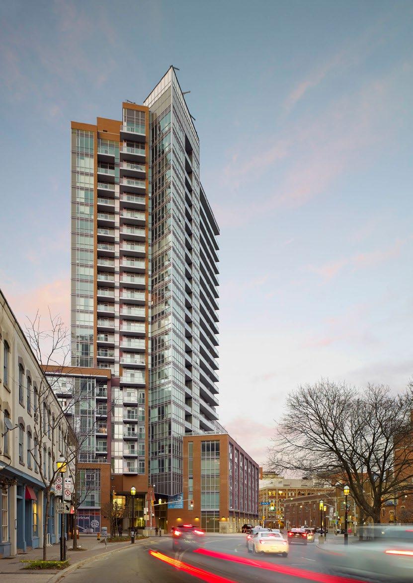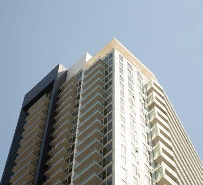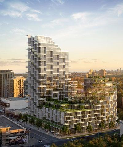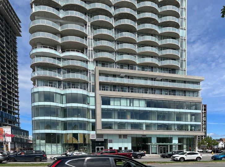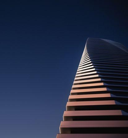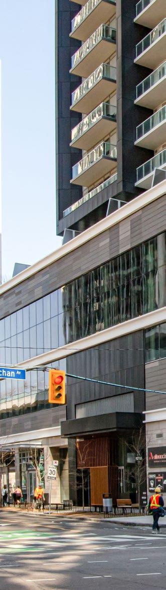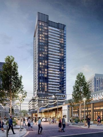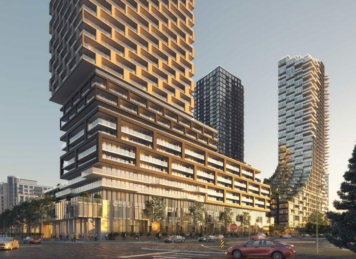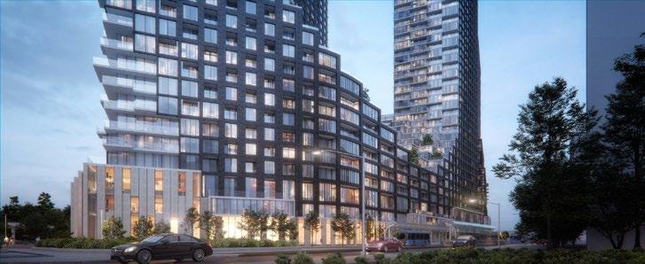 The two NOVUS towers, of 34- and 25-storeys, are a part of the Garrison Point mixed-use development that sits at the east gateway entrance to Toronto’s Liberty Village and is bounded by two railway lines – CN Rail and GO Train – and Strachan Avenue. The towers share a four-storey podium comprised of retail and commercial units on the first three floors and a retail patio located to at the north-east corner. At grade the podium is clad with Algonquin limestone with a granite base to create a luxurious street level atmosphere. The second and third floor commercial areas are clad with terracotta panels to tie in with the red-brick of the existing neighbourhood. Green roofs on the fourth and fifth floors enhance the sustainability profile of the buildings. The towers, visually narrowed through the articulated façades that feature lighter coloured finishes on one side, rise elegantly and are occupied by 579 purposebuilt rental residential units. Indoor and outdoor amenities spaces are provided on the top floor of each tower and shared amenities spaces are located in the fourth floor of the podium. A pedestrian pathway connects the towers to Strachan Avenue to the west and to the planned public park to the east.