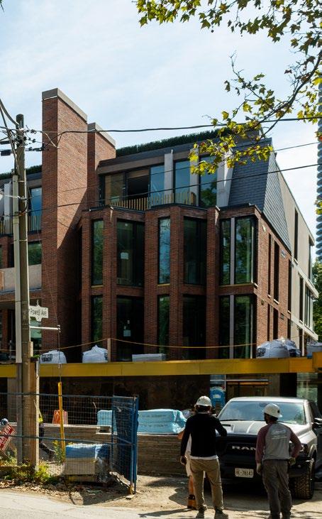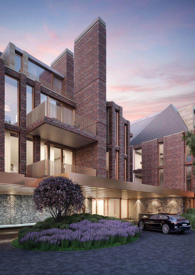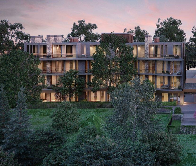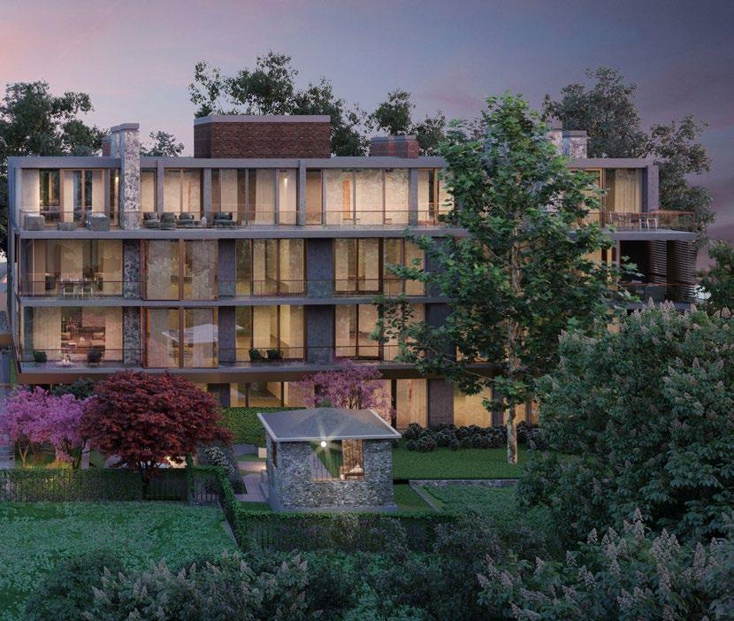 No. 7 Dale is an exclusive new development overlooking Toronto’s Rosedale Valley. The boutique 26-unit condominium project will bring modest and refined density to one of the city’s most sought after neighbourhoods, introducing a contextually sensitive addition to the area. Comprised of two connected buildings, the project’s conjoined structures—which read as a single mass from the street—rise to a height of three-storeys, while a four-storey frontage overlooks the Valley. Revealing two distinct ‘faces,’ the north façade draws inspiration from the language of the neighbourhood, characterized by stately singlefamily homes. The highly site-specific design embeds the project in the tree-lined street with projecting bay windows and balconies, facades framed in red brick and stone and four large stone-clad chimney-inspired masses gracing Dale Avenue frontage, with additional chimneys flanking the building’s sides. In contrast, the south-facing units are expansive, open and explode with glass and feature private terraces that create a contemporary aesthetic enveloped by breathtaking views of the natural landscape.