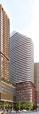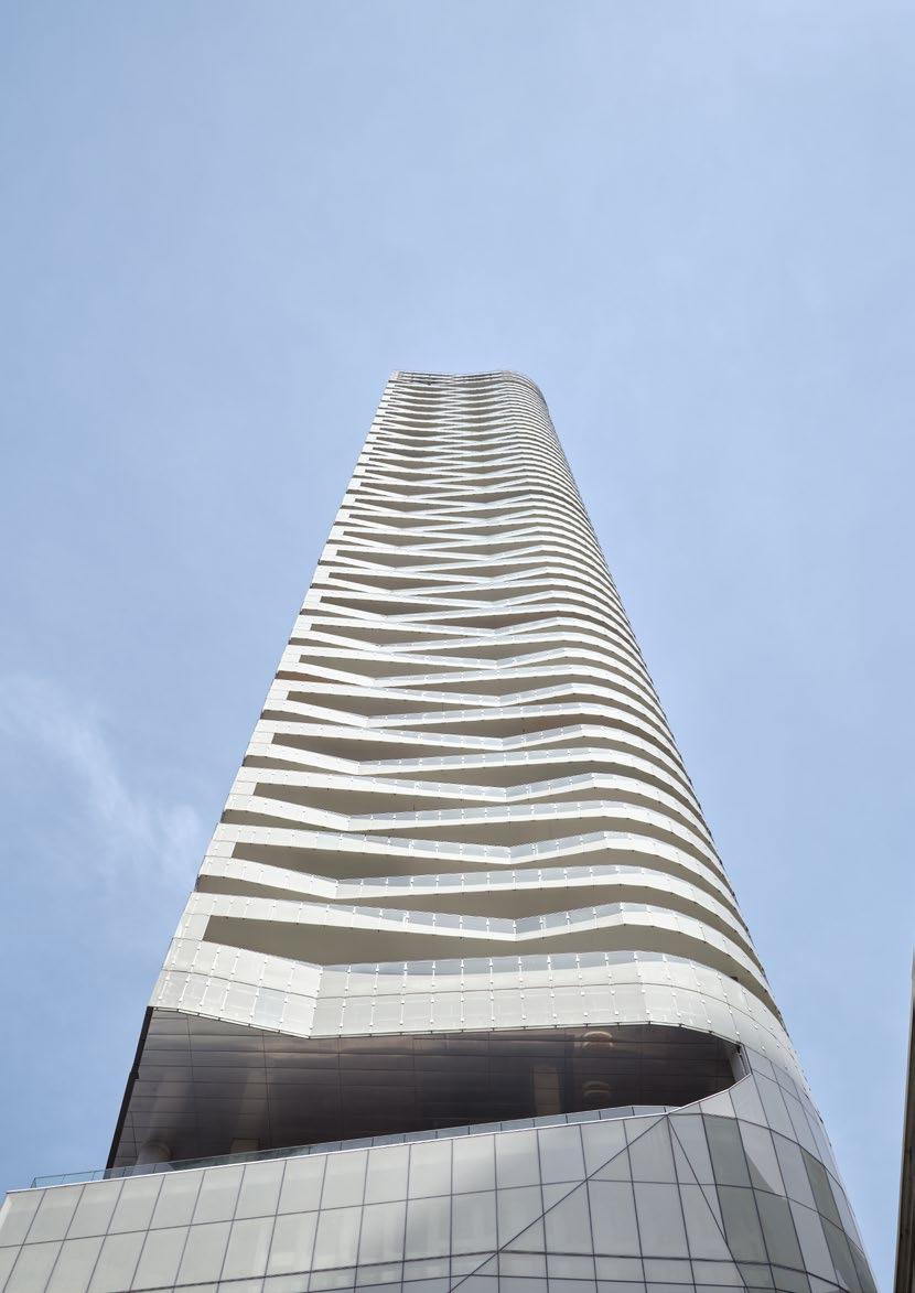 With a unique sculptural form, this residential tower peels back from the corner, widening the public realm.