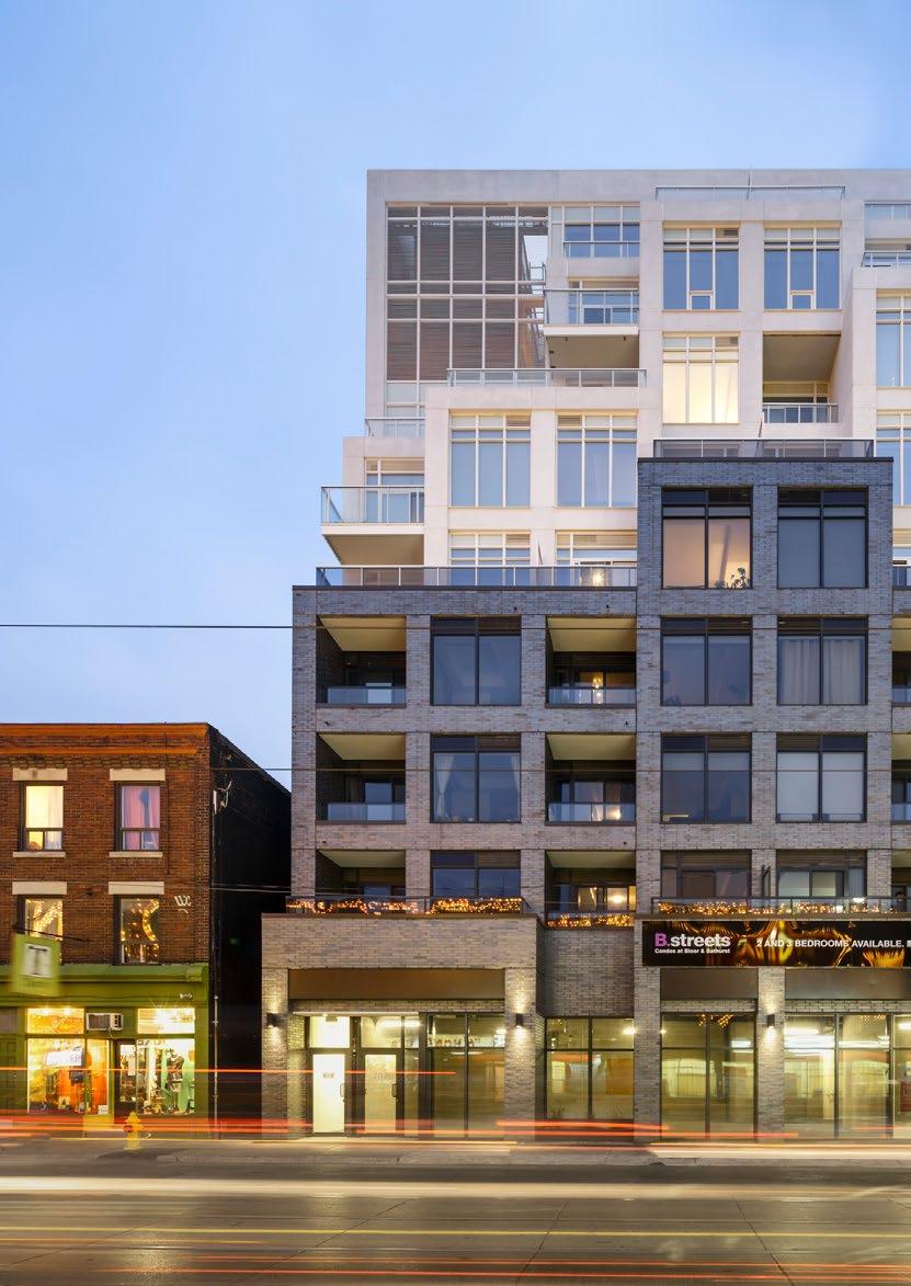 B.Streets Condos takes design advantage of its situation in downtown Toronto to create a dynamic street experience that efficiently choreographs public, private and parking access. The mixed-use condominium and retail project fronting on Bathurst Street and Loretta Lane contains nine floors of residential space atop ground level retail. The typical downtown Toronto laneway provides entry to six additional townhouses. On Bathurst, the upper levels set back in a massing strategy derived as a creative response to zoning envelope restrictions.