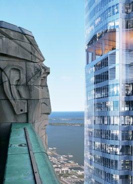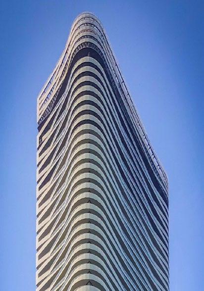 Adjacent to one of Toronto’s most recognizable landmarks, the new City Hall, and in close proximity to the Eaton Centre, Art Gallery of Ontario and the downtown business district, One City Hall Place is situated at the apex of Toronto’s history, politics, art and commerce. Prominently situated on the Bay Street corridor, it is a substantial landmark in the surrounding urban fabric. Phase 1 comprises a U-shaped structure incorporating retail and office space on the pedestrian-accessible ground floor, topped by 17 storeys of condominium residences. Visual interest is created by various massing components, articulated through a palette of stone, glass and metal accents. With Phase 2, a perimeter block scheme is created at Bay and Dundas Streets with an elegant, 50-storey ellipseshaped residential tower supported by a low lying podium of retail and commercial space, and an internal landscaped courtyard that marries the two Phases. Recreation, fitness and spa facilities include a sun-drenched swimming pool and gym overlooking a landscaped rooftop garden. All suite configurations are designed to maximize efficiency with multi-purpose spaces and compact appliances. At the same time, large expanses of glass and outdoor balconies on every suite create the feeling of spaciousness, providing spectacular views of downtown and allow natural light to penetrate through the interior courtyard.
