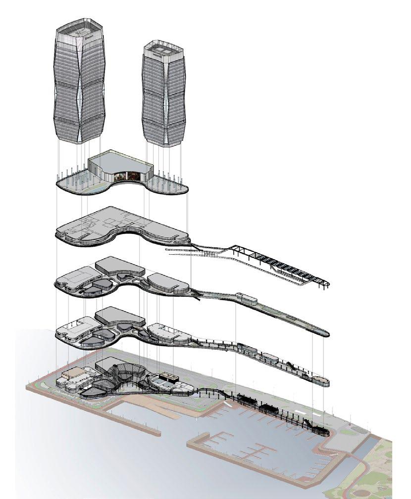 Exploded Axonometric View — Three tapering blocks rise from the podium