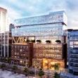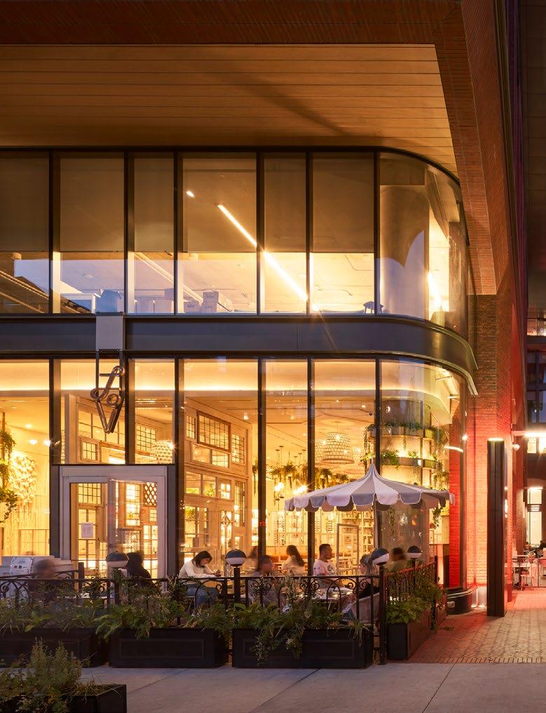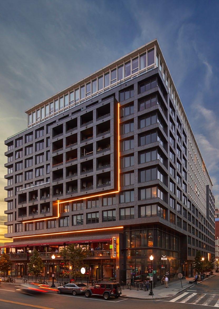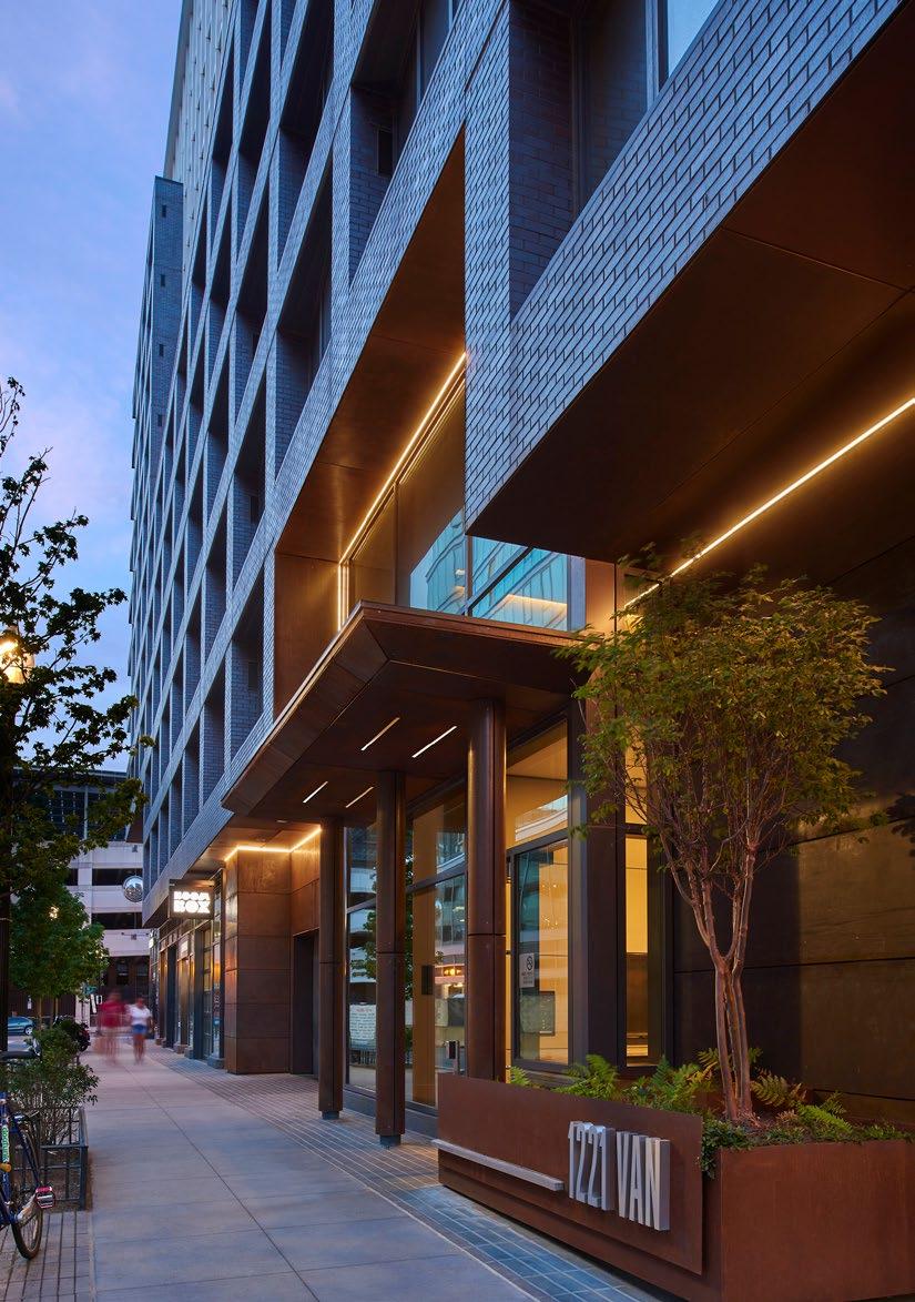 The dynamic façade and material pallet reference the industrial history of the downtown Washington site, retail spaces spill onto the sidewalk, offering a dynamic streetscape.