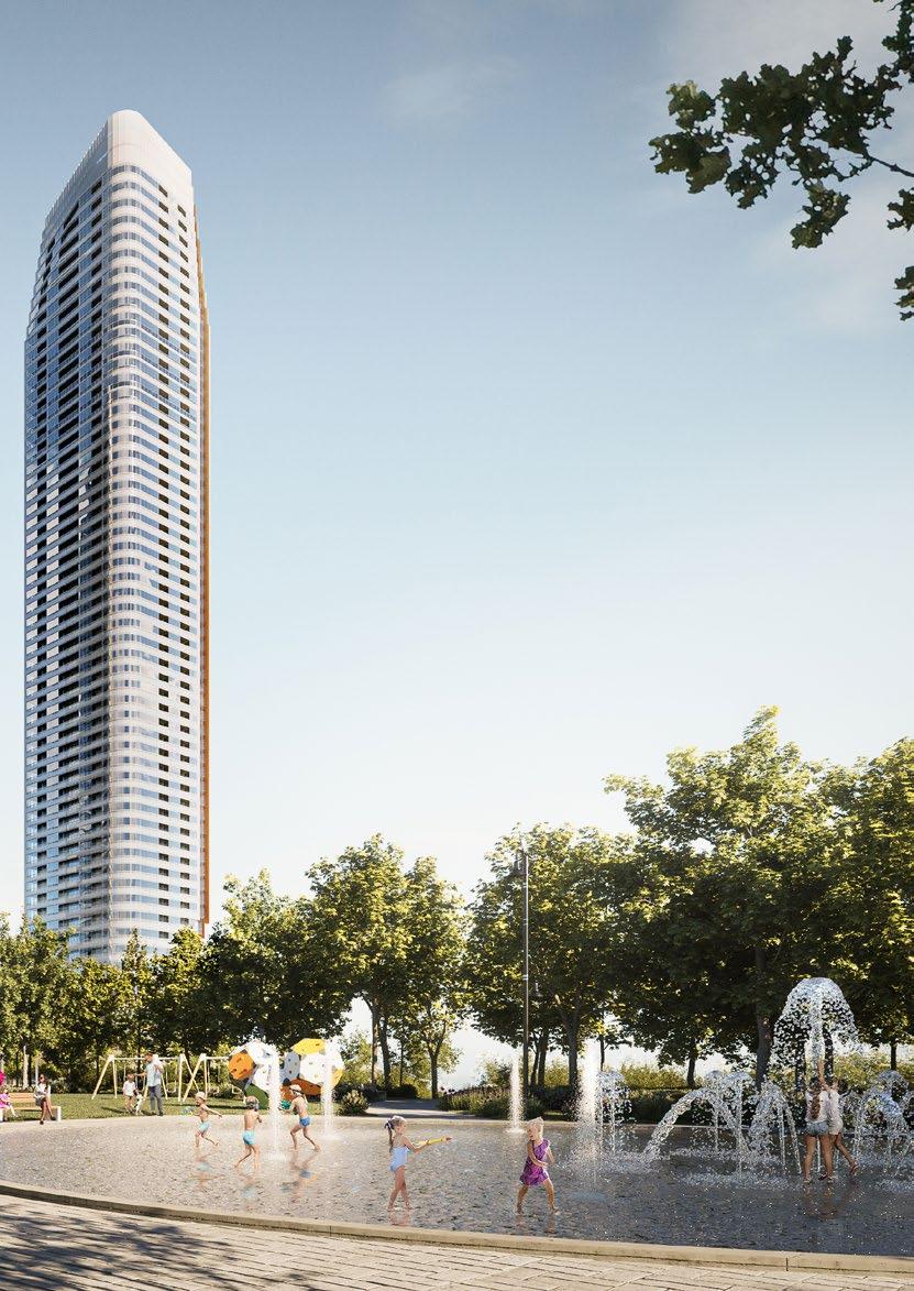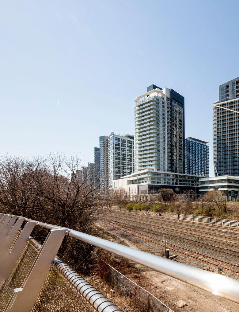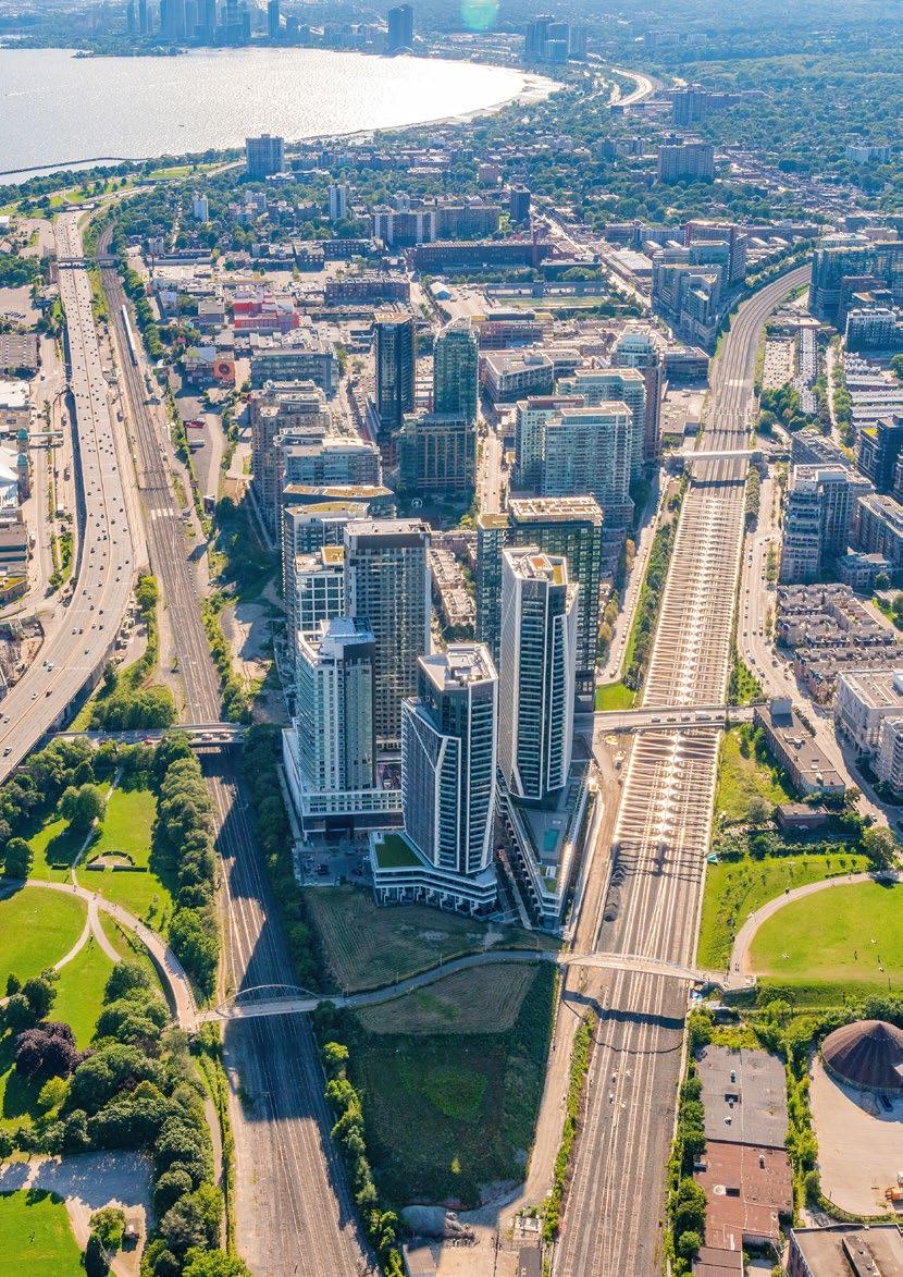 The development assembles larger than usual apartment plans to attract families—in smaller than usual building footprints—for an open spatial experience at the urban scale. Massed as individually sculpted forms, each tower contributes a distinctive silhouette to the Toronto skyline. The overall composition acts as a counterpoint to the more uniform housing in nearby Liberty Village. Residents share amenities, and direct access to green space in the proposed four acre park. For the city at large, the park serves as an anchor for the new Fort York pedestrian and cyclist bridge, providing critical links between the soonto-be expanded Stanley Park to the north, Liberty Village to the west and the lakefront to the south.