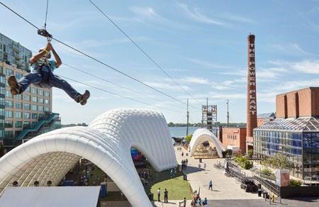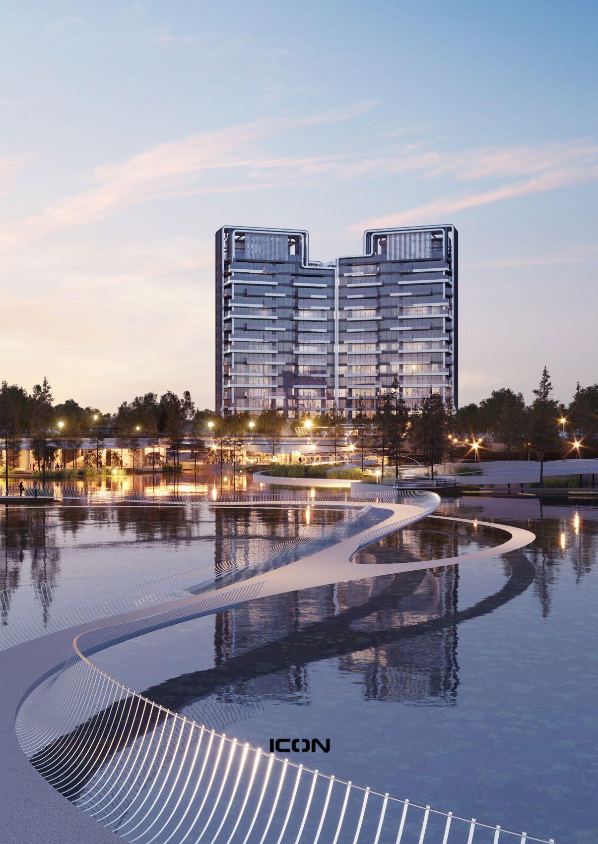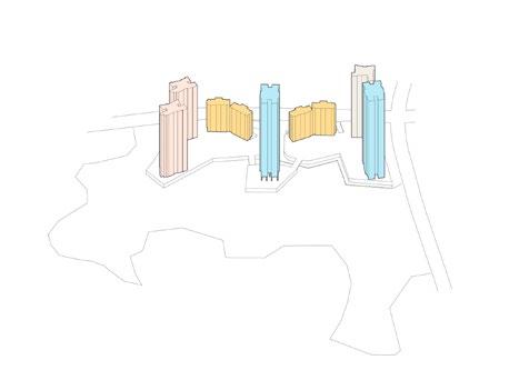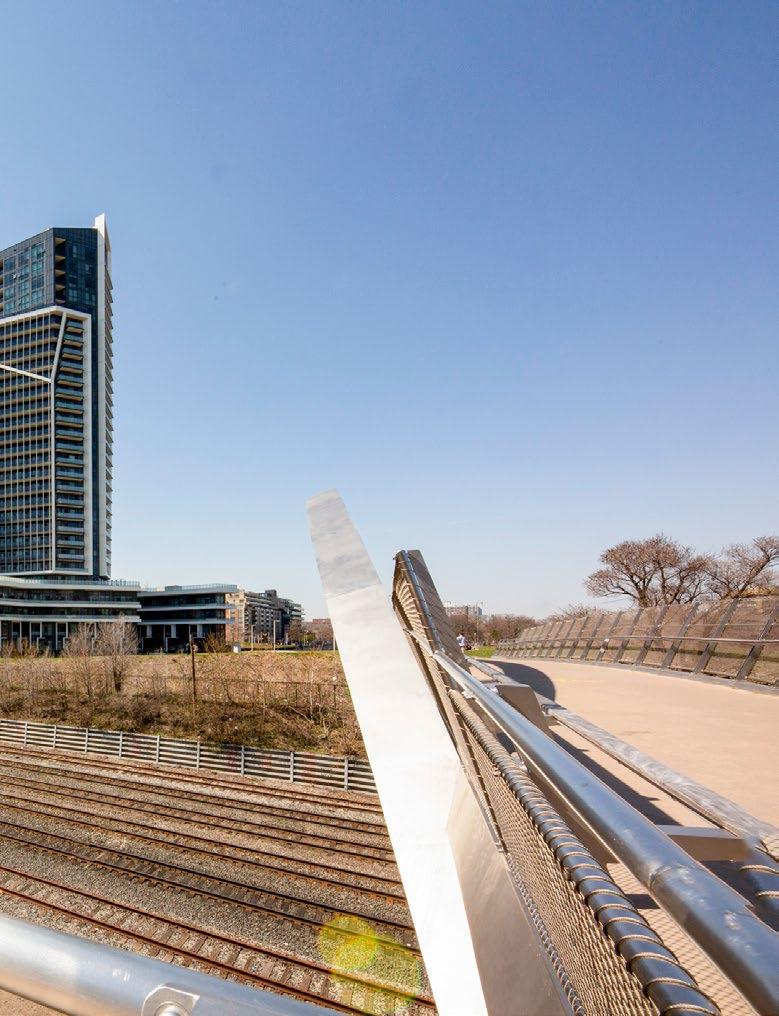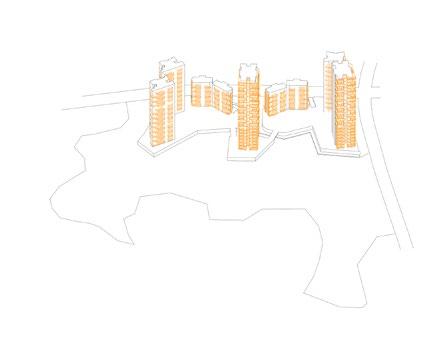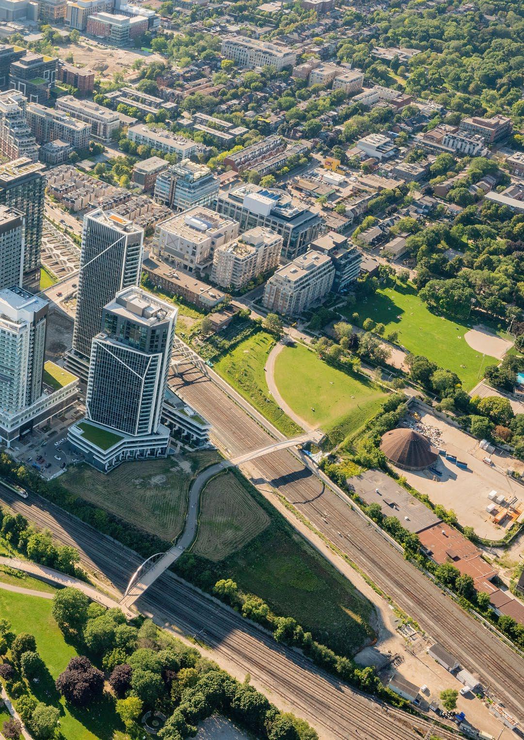 The development assembles larger than usual apartment plans to attract families—in smaller than usual building footprints—for an open spatial experience at the urban scale. Massed as individually sculpted forms, each tower contributes a distinctive silhouette to the Toronto skyline. The overall composition acts as a counterpoint to the more uniform housing in nearby Liberty Village. Residents share amenities, and direct access to green space in the proposed four acre park. For the city at large, the park serves as an anchor for the new Fort York pedestrian and cyclist bridge, providing critical links between the soonto-be expanded Stanley Park to the north, Liberty Village to the west and the lakefront to the south.