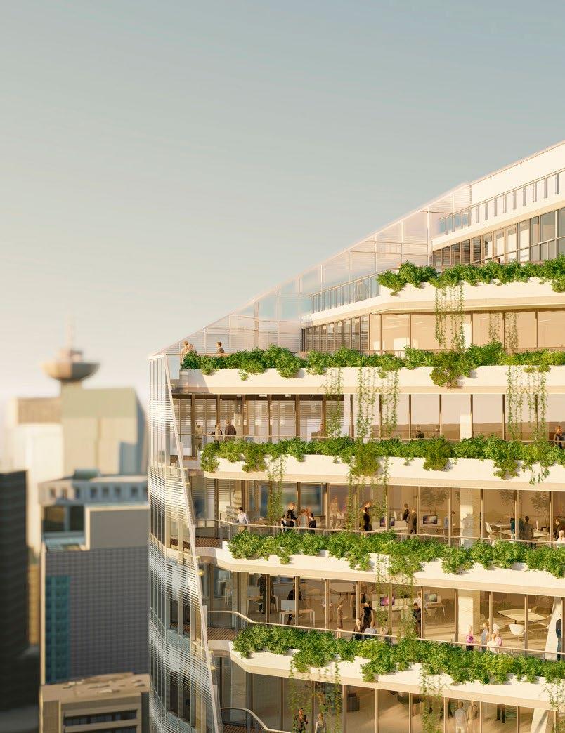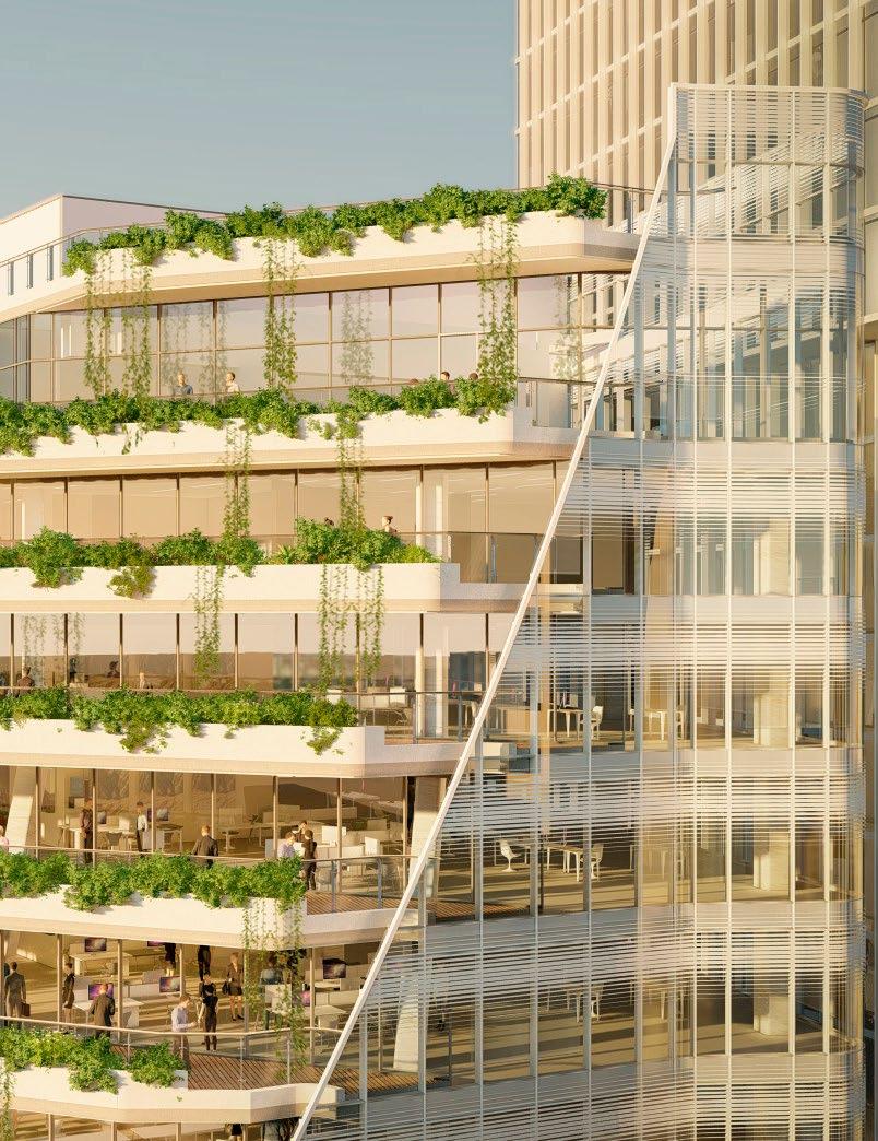 Sustainability is at the forefront of the development and played heavily into the final form and materiality of Tower 1 with an overarching strategy to minimize glazing ratios. A green wall is proposed to cover the bus terminal on the West side of the building