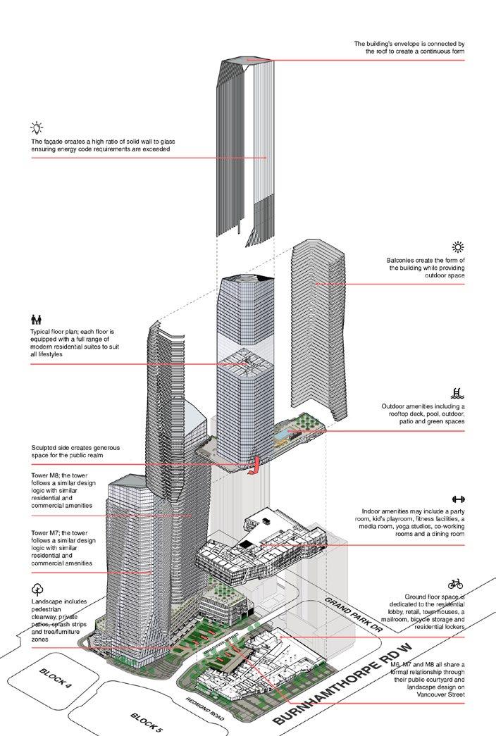 As a continuation of past planning and design efforts, the project will deliver on the vision of revitalizing the shopping centre and intensifying the site with 37 new towers. Conceived as an expansion to this vibrant community, the project will transform under developed blocks around Square One into a dynamic and interconnected urban environment by adding new community parks, residential, retail, and commercial spaces unified by a network of pedestrian-oriented streets. Enhanced mobility access is created by placing transit as a focal point for the development, with the anticipation of light rail transit and bus rapid transit being introduced in the near future. The mixed-use nature of the site will help build this employment base by attracting businesses and workers who seek an urban environment within a thriving and sustainable downtown core.