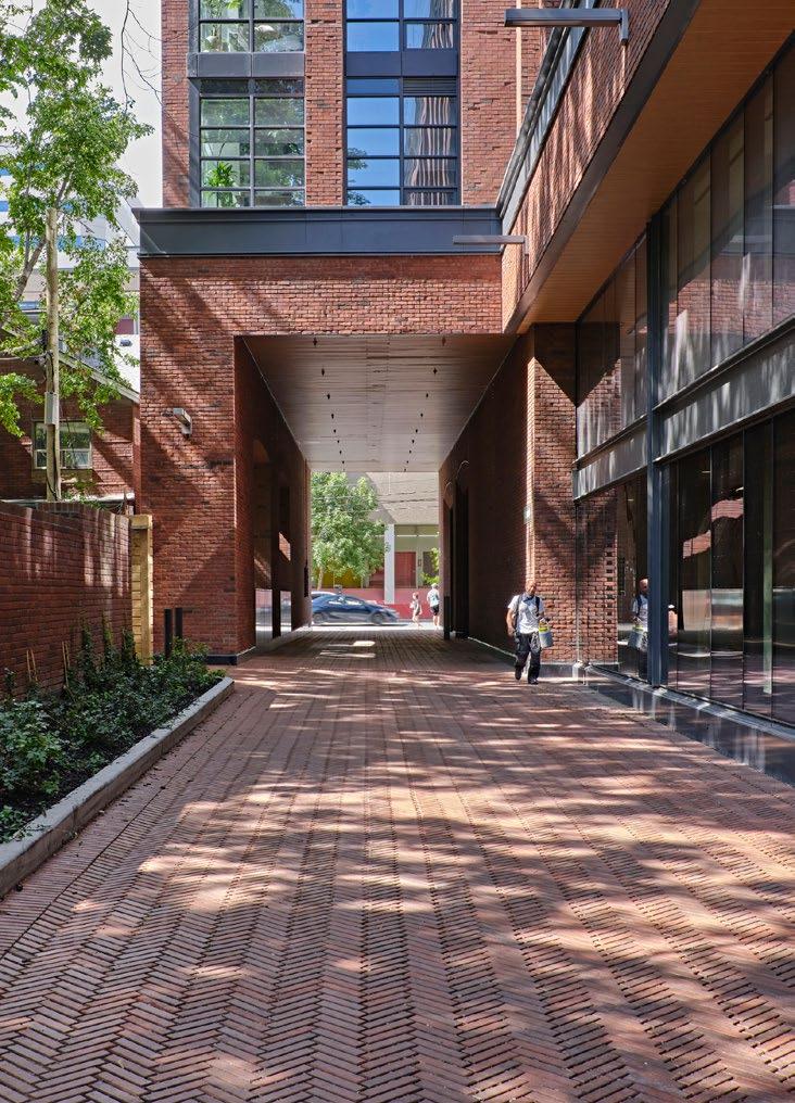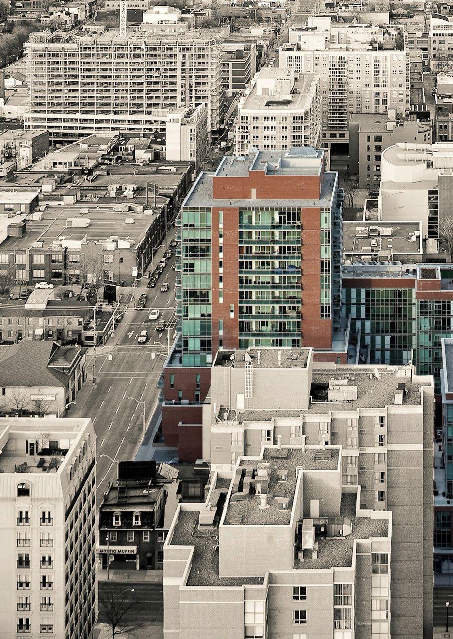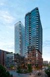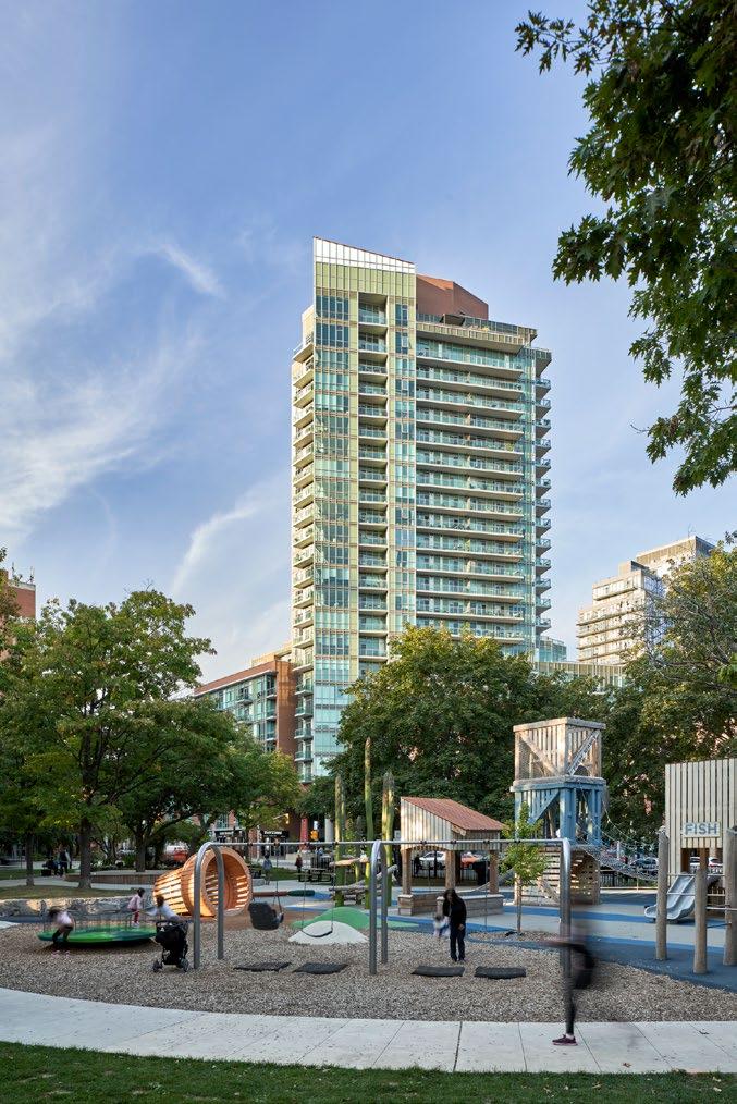The red brick of the podium recalls the historic neighbourhood building fabric, and contrasts with the spandrel glass and deep mullions of the towers. These white mullions extend past the roof, concealing the mechanical penthouse and creating a distinctive tower cap. Slender white precast fins visually integrate the podium with the towers. Seeking to set new sustainable design standards for the community, the building includes 50% solid surfaces in order to increase efficiency and minimize thermal transference. Landscaped spaces and green roofs provide a visual and physical resource for residents while mitigating the urban heat island effect. These ecological engineering efforts helped the buildings to achieve a LEED Gold certification.