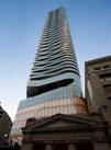 The design of the building, situated in a neighbourhood of 19th century warehouses and next to two similarly tall towers, responds to its context. The slate grey masonry of the podium and blue-tinted glass of the tower contrasts with the warm brick and terra cotta of adjacent buildings. The tower deviates from a rectangular form by curving downwards in a slight wedge shape along the Adelaide Street façade. Creating an interesting backdrop for the public plaza, the mass of the podium is broken by a geometric interplay between windows, balconies, and support structures.