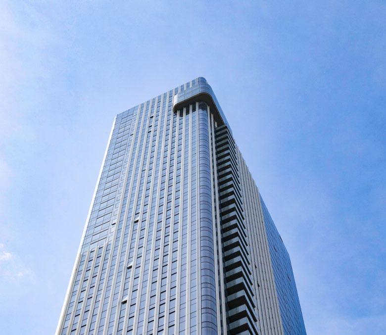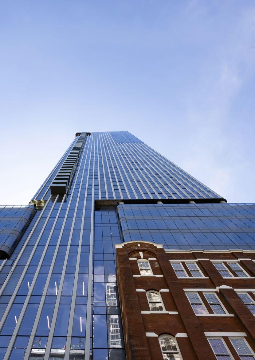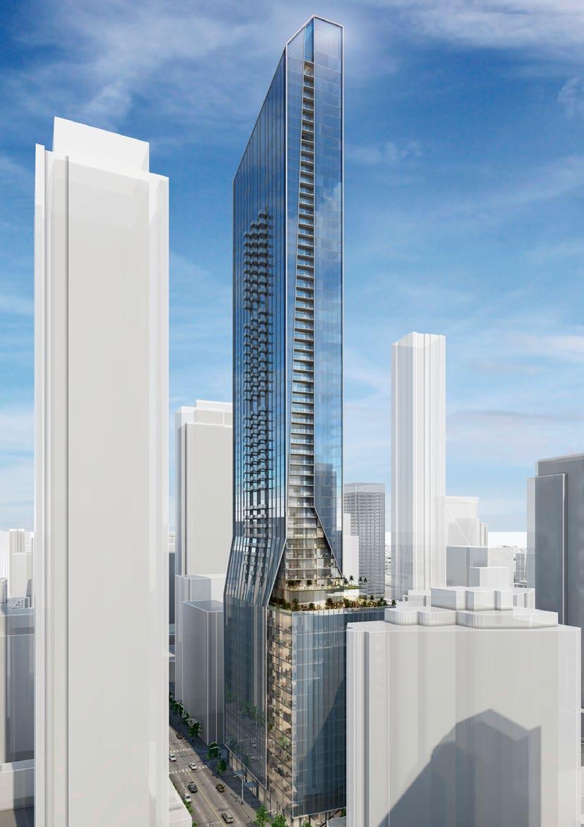 The heritage façade maintains the streetscape, while the 57-storey tower’s height is emphasized with vertical fins.