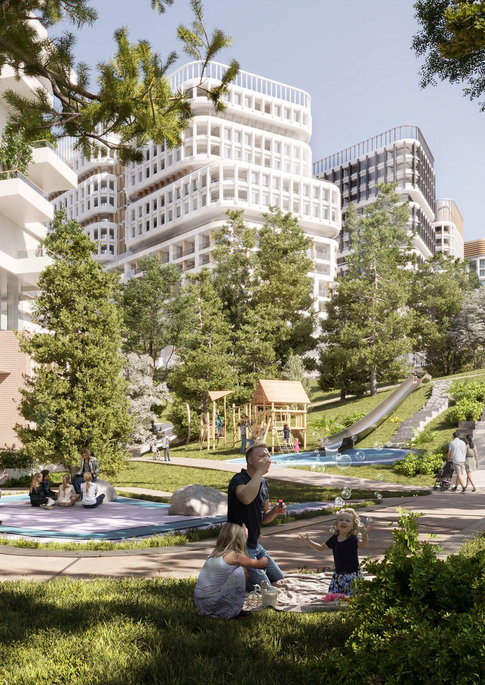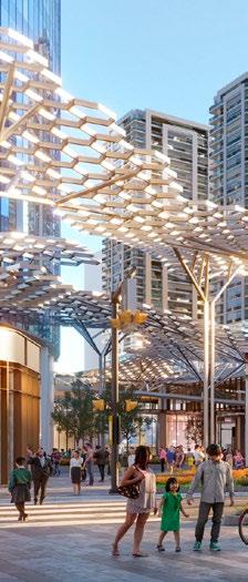 Structured along a curved axis characterized as “the Bow,” the public realm for Phases 1 and 2 will unite two existing civic anchors – the Civic Plaza to the north, and Central City Plaza to the south – while integrating with the Surrey Central SkyTrain station and broader transit infrastructure. Above, a canopy will be suspended over the Bow to provide shade and weather-proofing for pedestrians. The built form on site will draw inspiration from the architectural legacy of the City Centre and nearby Simon Fraser University campus to create a distinct identity and sense of arrival. As part of a complete community, the project sets out to attract major institutions and employers to reinforce the city’s function as the region’s second downtown.