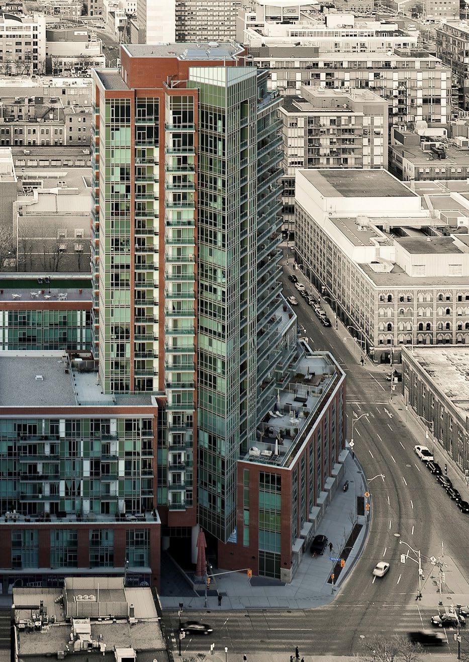 The building massing steps back varyingly across the site to establish different height street walls, defined in conversation with the surrounding urban fabric. On the perimeter of St. James’ Park, terraces and balconies offer residents views of the park, St. James’ Cathedral and the downtown core. Rising from the base, the 24-storey tower seems to dematerialize into an extensive glass curtain wall. The masonry podium takes its visual cues from the surrounding industrial buildings, allowing for seamless integration with the area.