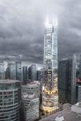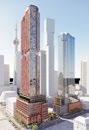 A proposed 63-storey mixed-use tower that picks up elements of the burtalist podium it sits on top via the precast concrete, punched window