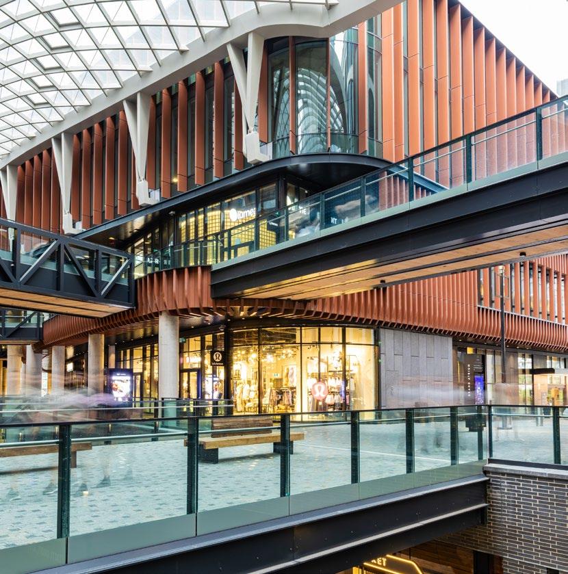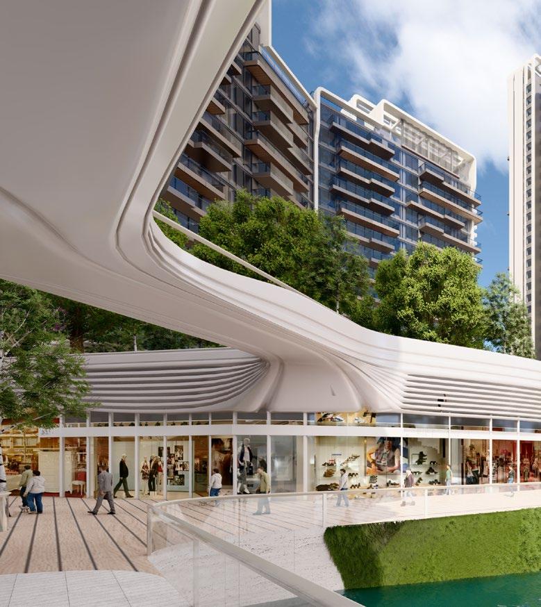 A significant linear park will be created along Wellington Street connecting to Victoria Memorial Park to the west and Clarence Square to the east. The pedestrian-centred plan will restrict vehicles to a few underground garage access points and will use existing laneways and new promenades to link existing pocket parks to a retail oriented pedestrian thoroughfare that crosses the neighbourhood bringing a mix of international chains, independent boutiques, and restaurant patios. The undulating glass canopy will allow access to the street year-round.
