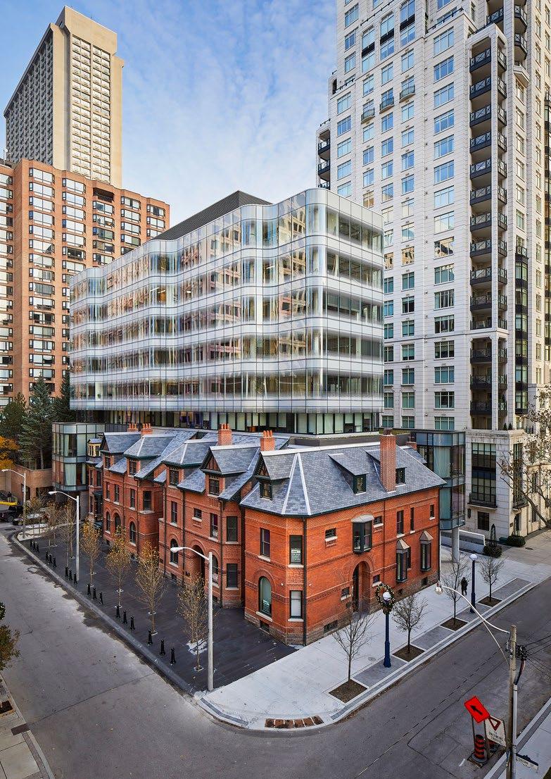 100 Yorkville at Bellair is a mixed-use development in the heart of Yorkville, a densely urban district of high-end retail, dining, and residences. Traversing the centre of a block, the project weaves itself in and around the existing neighbourhood. Organized around a landscaped courtyard, the development includes retail, commercial, and residential uses. The western and eastern edges are bookended by two condominium towers of eight and 17 storeys. To the north, along Scollard Street, a row of traditionally-styled townhouses help the project blend with the low-rise, Victorian-era surroundings. The southwestern edge, along Yorkville Avenue, incorporates the 1923 façade of the original Mount Sinai Hospital. Completing the southern streetscape is a two storey retail building that is interrupted by a row of existing houses.