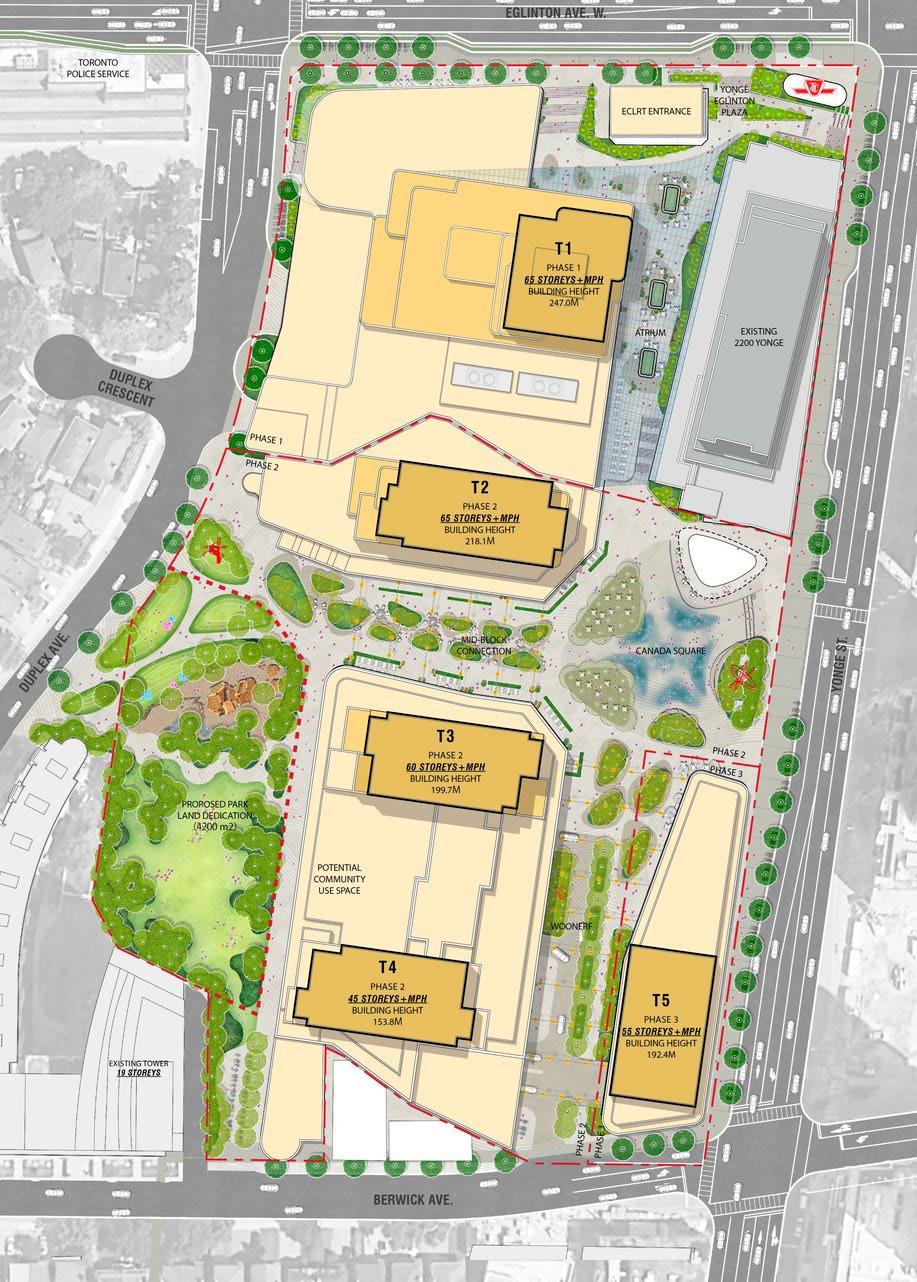 The center of Midtown Toronto is in the process of dramatic change. Radiating from the corner of Yonge Street and Eglinton Avenue, increased housing density and improved transit access will have a profoundly positive affect upon the vibrancy of Midtown’s center. We envision the Canada Square Master plan as a showcase for development in the city, driven by a strong belief that integrated vertical urbanism can create unique, multi-functional urban complexes that highlight the best qualities of Toronto - high density towers, quality public space, and a seamless integration into the existing urban fabric. Toronto’s diverse urban quilt of neighbourhoods has informed the approach to the Master Plan. A Master Plan that endeavors to add to the unique tapestry of Toronto, leveraging the transit requirements and existing buildings to inform the urban plan as a catalyst for great urban open spaces.