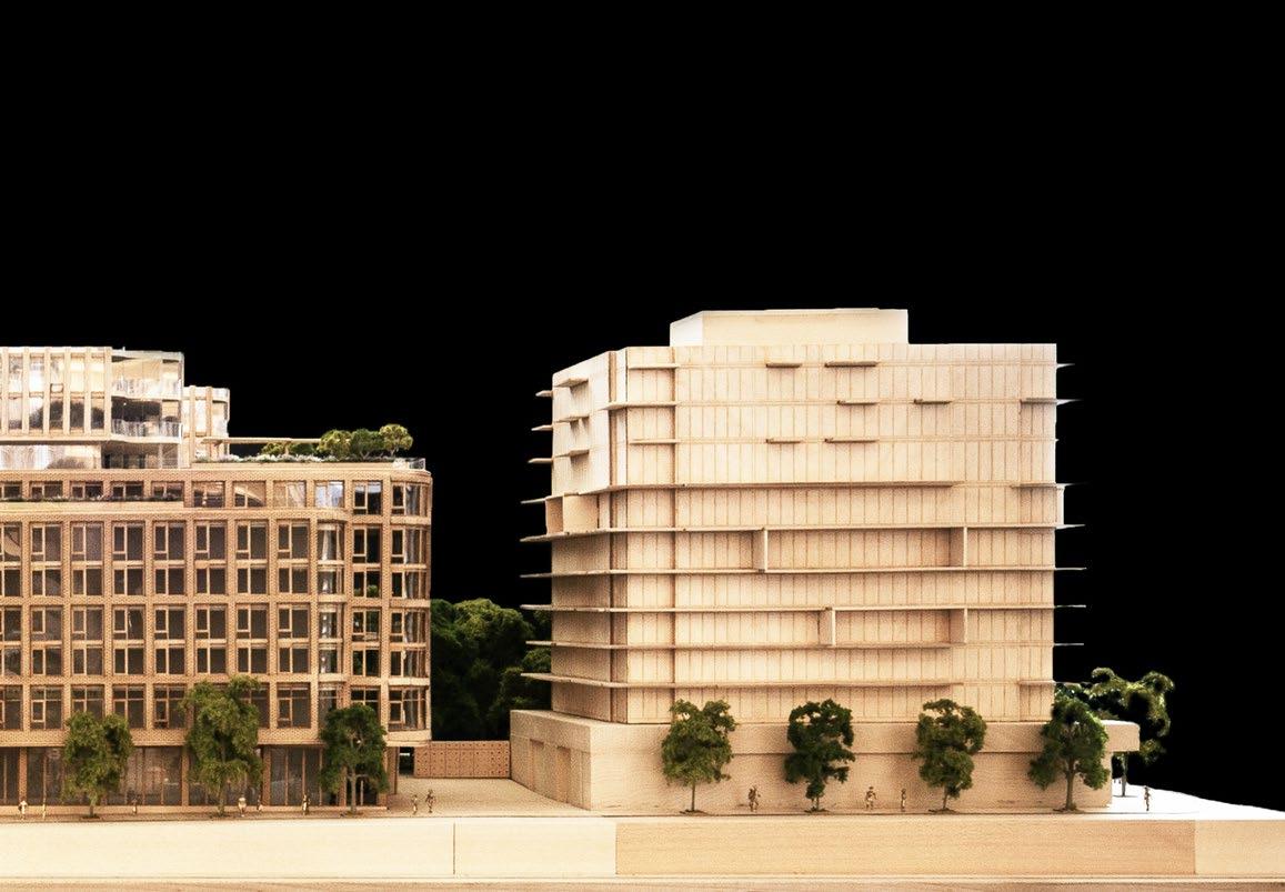 A natural material pallet and heavy massing anchor this development next to Toronto’s new City Hall.