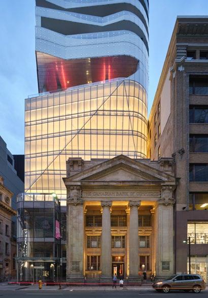 19 Duncan Street combines a 57-storey tower with the heritage-listed Southam Press Building built in 1908. The redevelopment renovates and adds office space to the site, with the majority of the tower comprised of rental apartments. The new building extends beside and over the existing 5.5 storey brick structure. To retain the visual integrity of the historic building, the two storey addition above is recessed at the first floor, with the second floor extending to the edge of the façade below. A green roof atop this addition is an amenity for the tower. The street level is enlivened by a restaurant sidewalk patio, accessed through new windows and doors respectfully cut into the existing architecture.