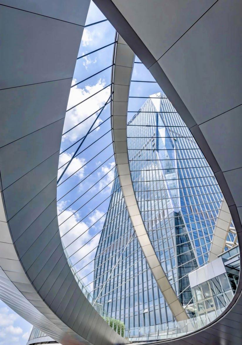The new building’s design features vertical fins of varying widths. The fins celebrate the vertical shape of the building, and help provide shade and minimize glare. Creating a playful rhythm, the fins cause one’s perception of the building to vary according to different viewing angles.