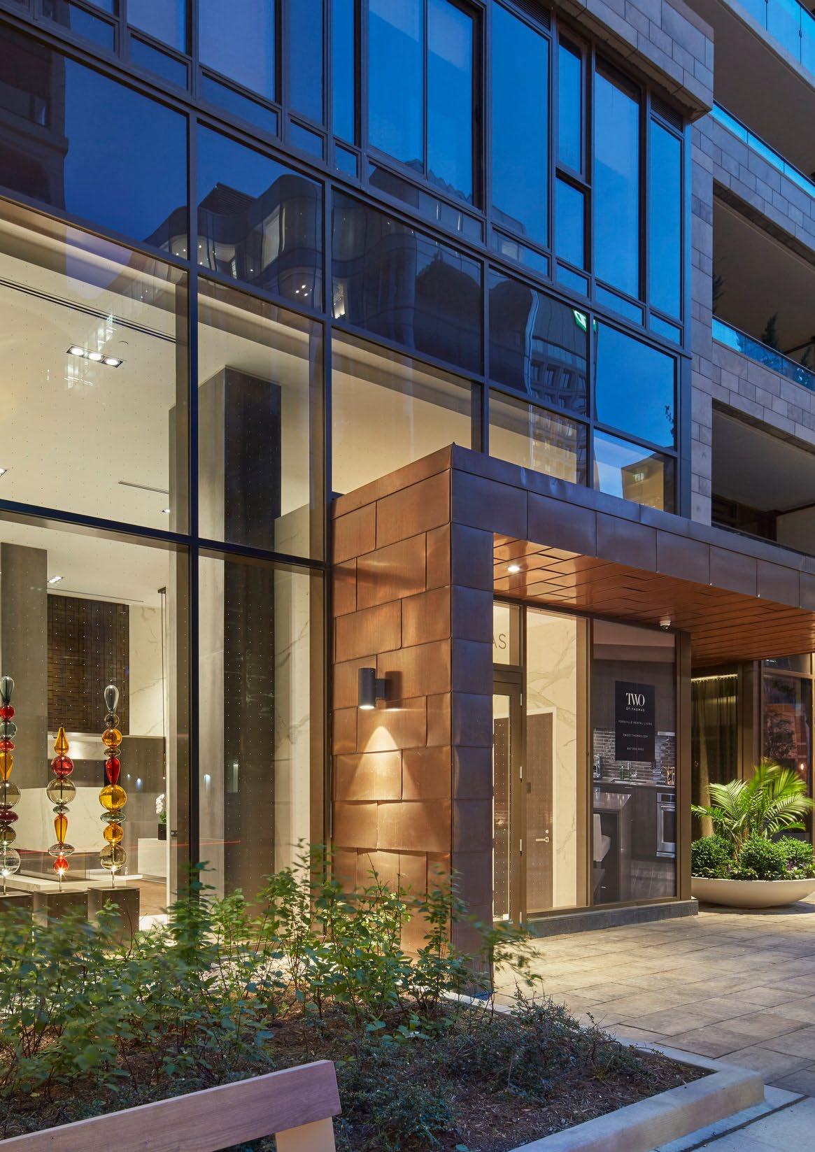 A luxurious and natural material pallet forms an opulent street level atmosphere for this mixed-use development.