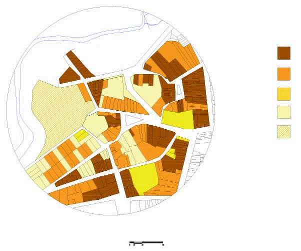O mapa de taxa de ocupação do solo revela uma área mista, onde há lotes com ocupação densa e outros com baixa ocupação. Essa disparidade pode ser atribuída ao fenômeno comum de expansão das residências de acordo com o crescimento das famílias. À medida que as famílias crescem, é comum que construam estruturas adicionais nos terrenos existentes, conhecidas popularmente como "puxadinhos". Isso resulta em uma alta taxa de ocupação do solo em alguns terrenos, enquanto outrospermanecemmaisvazios.Apresençadelotesmuitocheios e muito vazios no mesmo mapa indica uma dinâmica complexa de uso e ocupação do solo, influenciada pelos padrões de crescimento populacional e desenvolvimento urbano na área em questão.