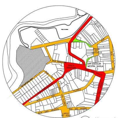 O mapa de hierarquia viária destaca a movimentada Praça Araguari como ponto central, com maior fluxo de veículos ao redor. Uma via principal conecta a praça de eventos à Praça Araguari, cortando a Rua Portuguesa ou TravessaSãoPaulo.Víascoletoras,representadas em laranja, possuem fluxo moderado, enquanto as vías locais, em cores diferentes, são menos utilizadasporveículos,sendomaisfrequentadas por moradores e pedestres. Esta hierarquia refleteumaáreacentralvibrante,comatividades comerciais e sociais concentradas, e fornece insightssobreaestruturaurbanadaregião.