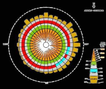 A porcentagem de horas em que o vento tem direção média de cada uma das quatro direções cordeais de vento, exceto nas horas em que a velocidade média do vento é inferior a 1,6 km/h. As áreas mais esmaecidas nas intersecções indicam a porcentagem de horas nas direçõesintermediárias implívitas (nordeste,sudeste,sudoesteenoroeste)
