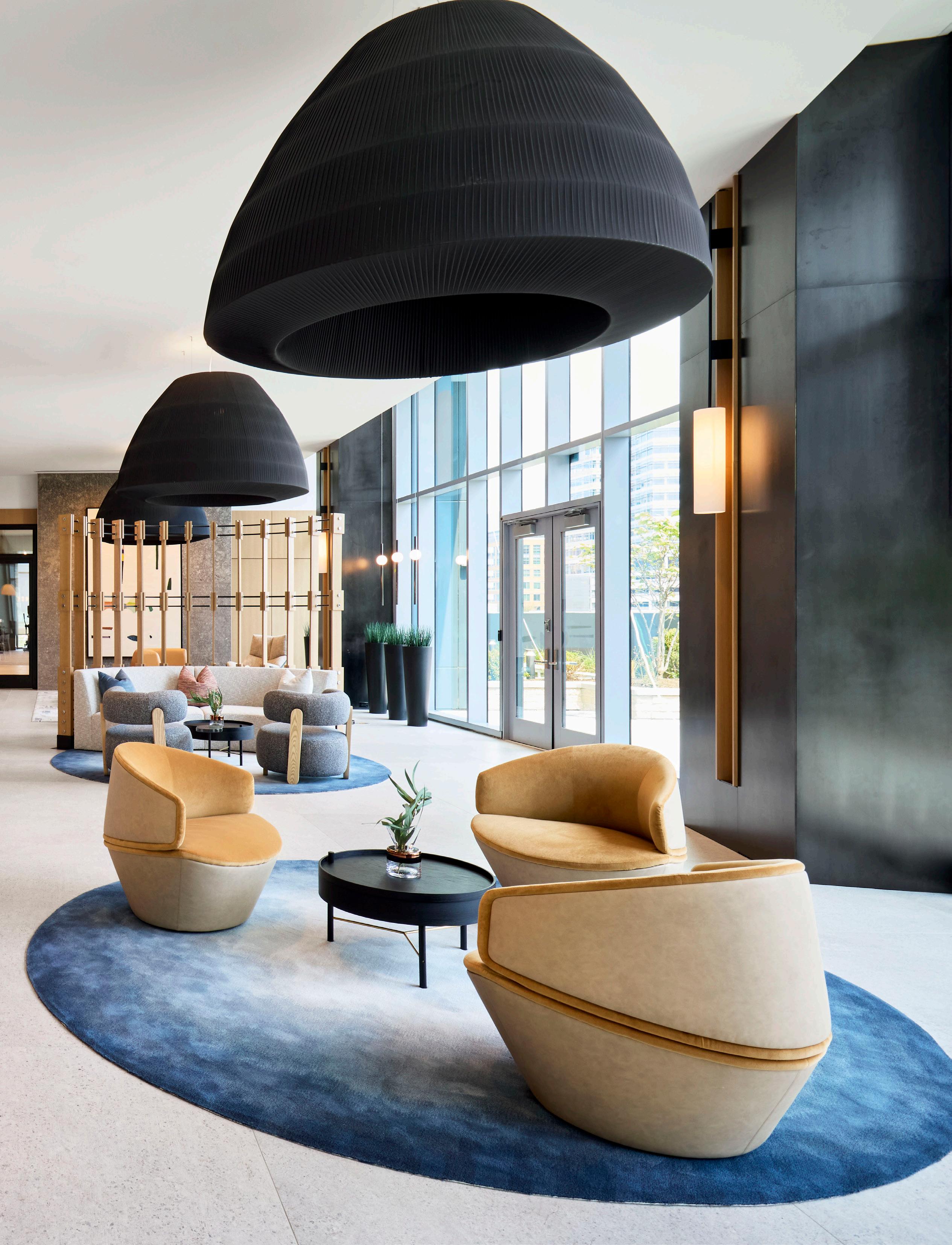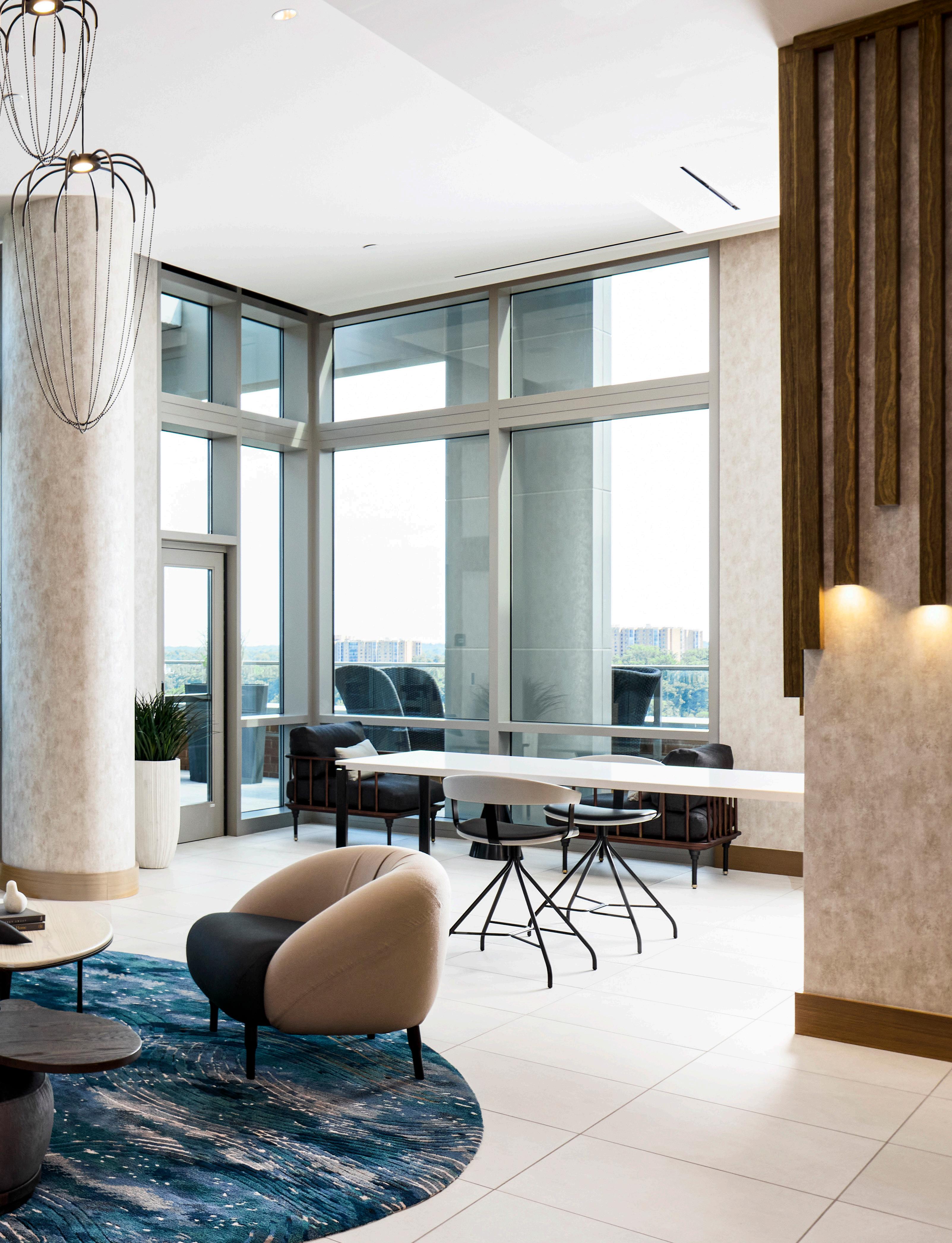 Style: A biophilic design and neuroaesthetics to create spaces that support well-being and a strong indoor-outdoor connection. The interiors balance casual elegance with organic textures and modern style, using natural tones, stone, and wood throughout the double tower’s inviting common areas.