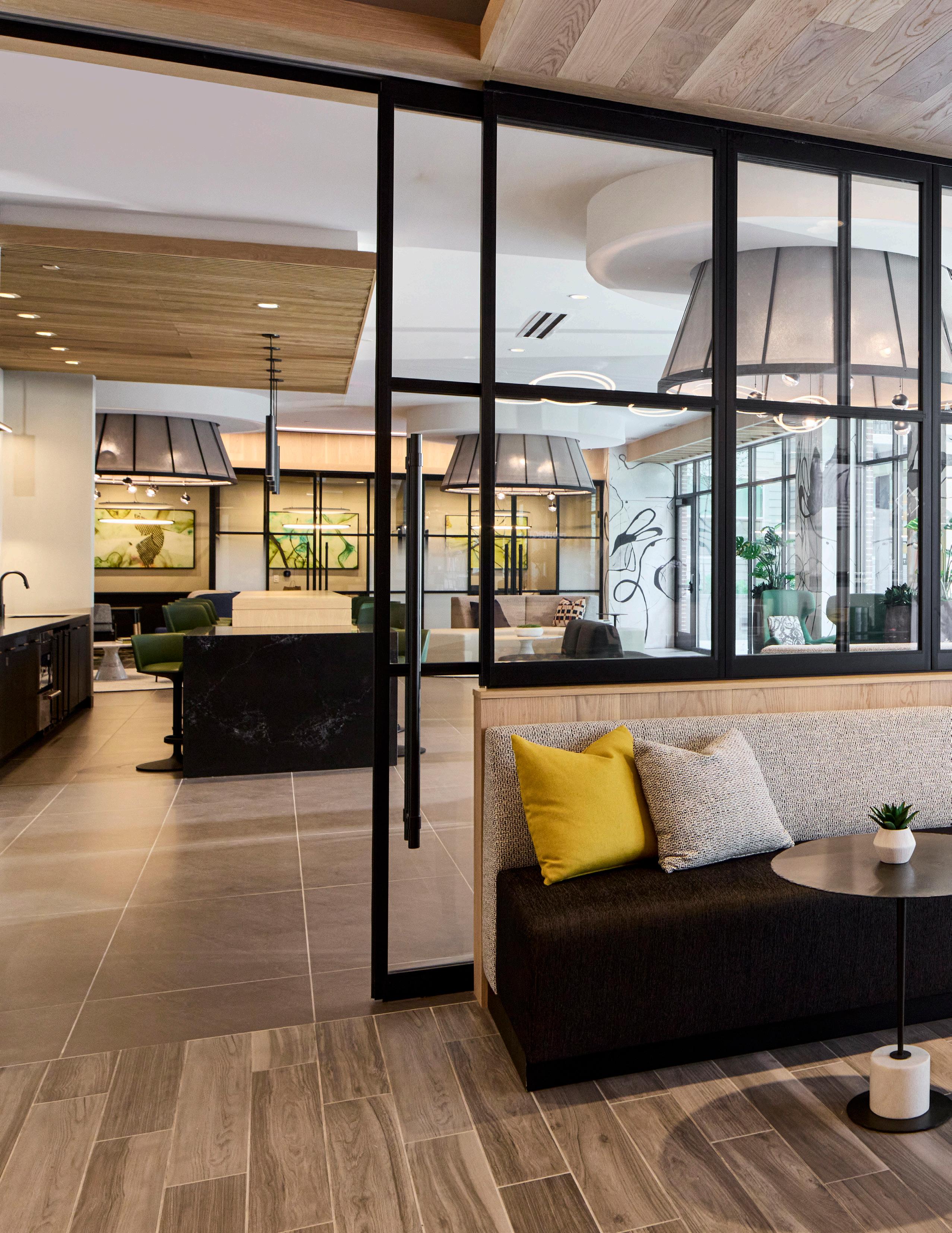 Style: A fresh, modern take on biophilic design, creating a serene connection to nature. Positioned to overlook the courtyard and pool, the amenities are filled with natural light and calming views. Warm wood, organic textures, and an earthy color palette infuse the space with wellness and sophistication, making this urban oasis both inviting and unique.