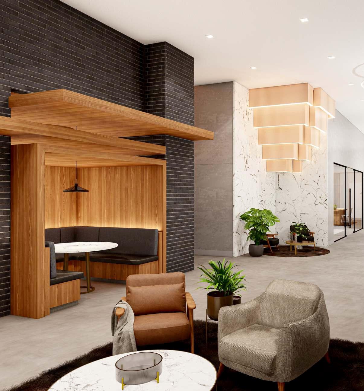 Style: A fresh, modern take on biophilic design, creating a serene connection to nature. Positioned to overlook the courtyard and pool, the amenities are filled with natural light and calming views. Warm wood, organic textures, and an earthy color palette infuse the space with wellness and sophistication, making this urban oasis both inviting and unique.
