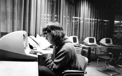 Research librarian Kathleen Donovan assists a student doing research