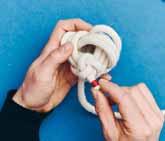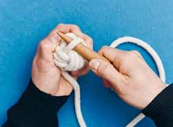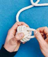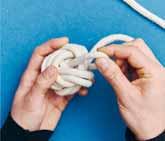BILD 7 und 8: Den Knoten etwas aufweiten und den Stopperknoten hineindrücken. BILD 9: Nun muss der Knoten noch festgezogen werden. Mit dem Ende beginnen, das sich im Stopperknoten befindet. Den Knoten ein bisschen straffen, damit sich der Stopperknoten nicht löst. Beim ersten Zug nicht zu stark ziehen, weil die Affenfaust sonst auseinanderfallen oder ihre Form verlieren könnte. 4
