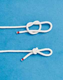 BILD 6: Überhandknoten. BILD 7: Überhandknoten mit Slip, also mit dem Abschluss durch eine Bucht – dieser Abschluss kann schnell gelöst werden.