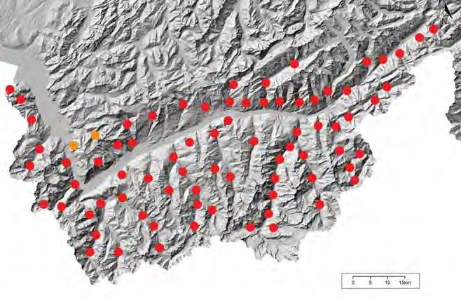 jungen Individuen. Diese ließen sich zuerst in den größeren Seitentälern, später auch in kleinen Tälern nieder. In besonders geeigneten Teilgebieten wie im Mattertal wuchs die Revierzahl im Verlauf der letzten 30 Jahre von vier auf heute sieben an. Auffallend kleine, nur etwa 20km2 umfassende Reviere wurden erstmals 2011 in der Val Ferret festgestellt. Später schien dies auch in anderen Teilen des Wallis bei neuen Paaren die Regel zu werden. Der Trend gipfelte in einem 2016 neu gegründeten nur gerade 8km2 großen Revier oberhalb Fully, dessen Paar auf Anhieb erfolgreich brütete (Denis 2021). In derselben Region entstand im Jahr 2020 nochmals ein weiteres erfolgreiches Minirevier (15km2). Weitere, aber noch nicht definitiv bestätigte Paare werden bei Liddes, in der hinteren Val Ferret und bei Vissoie vermutet. Den aktuell 75 Walliser Revierpaaren (Abb.11) stehen durchschnittlich je 69,5km2 Fläche zur Verfügung. Stellt man die für Steinadler nicht nutzbaren Gletscherflächen und Hochgebirgslagen in Abzug, sind es noch etwa 57km2 pro Paar.